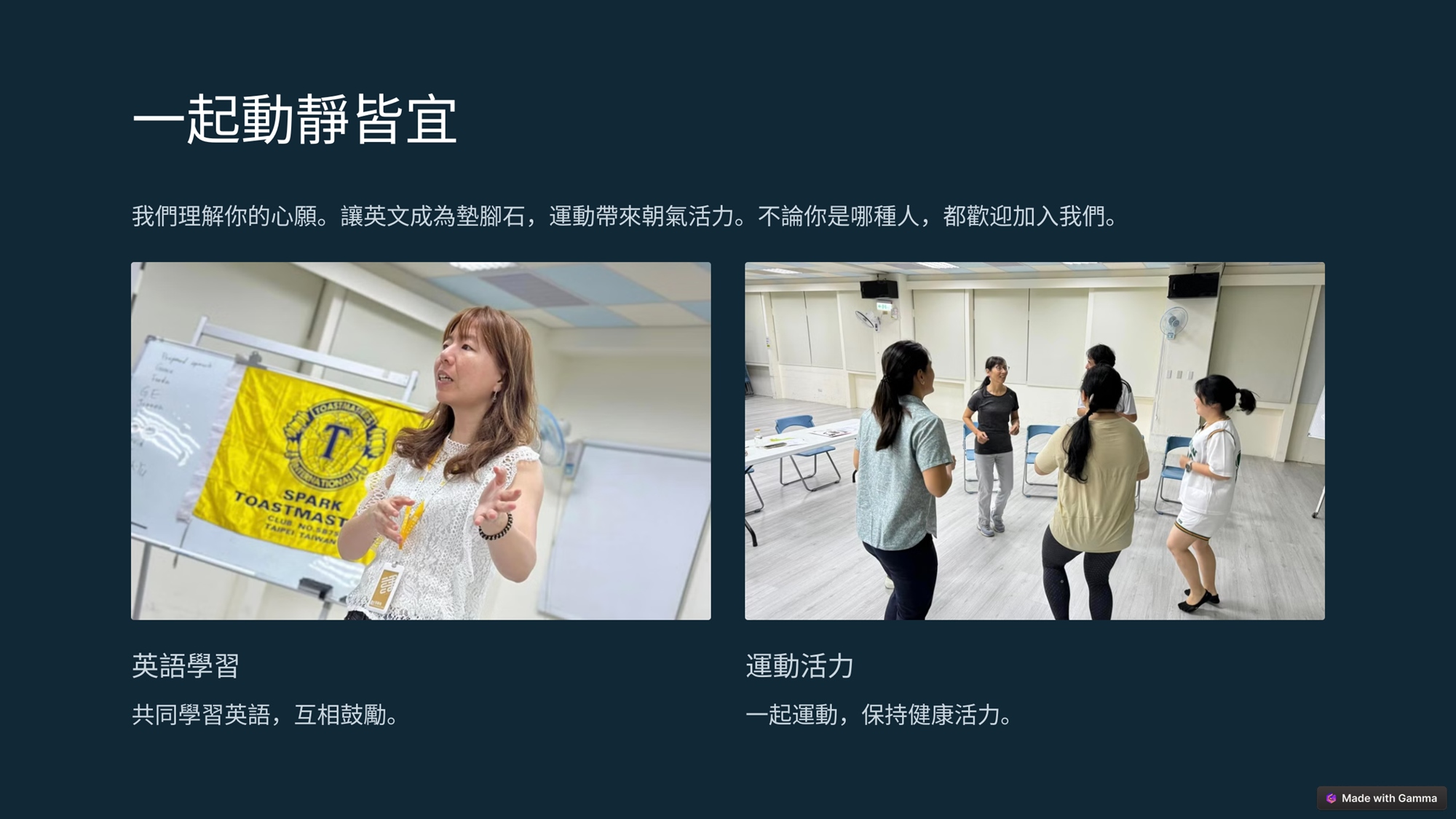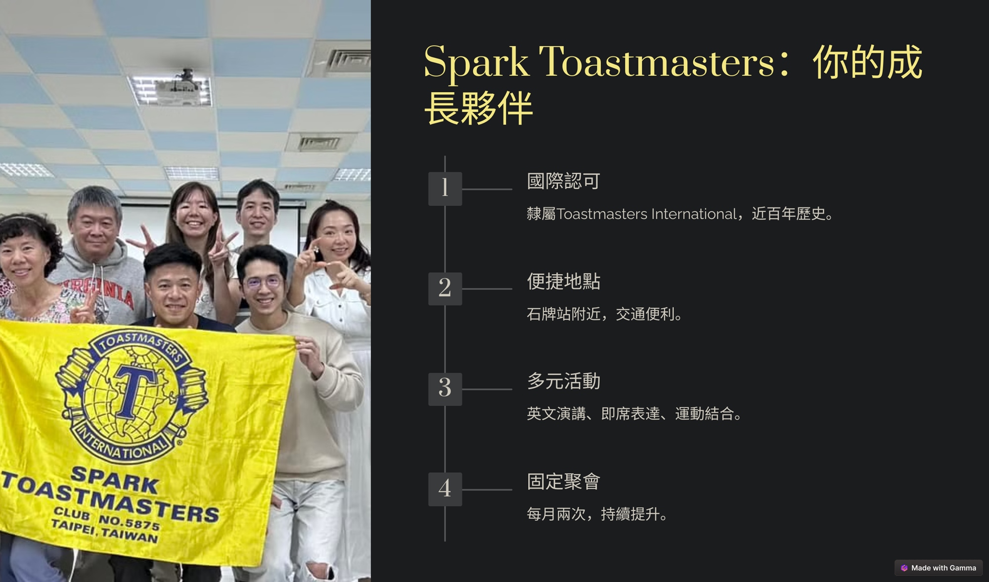 我們是位於捷運石牌站永明活動中心的Spark Toastmasters。