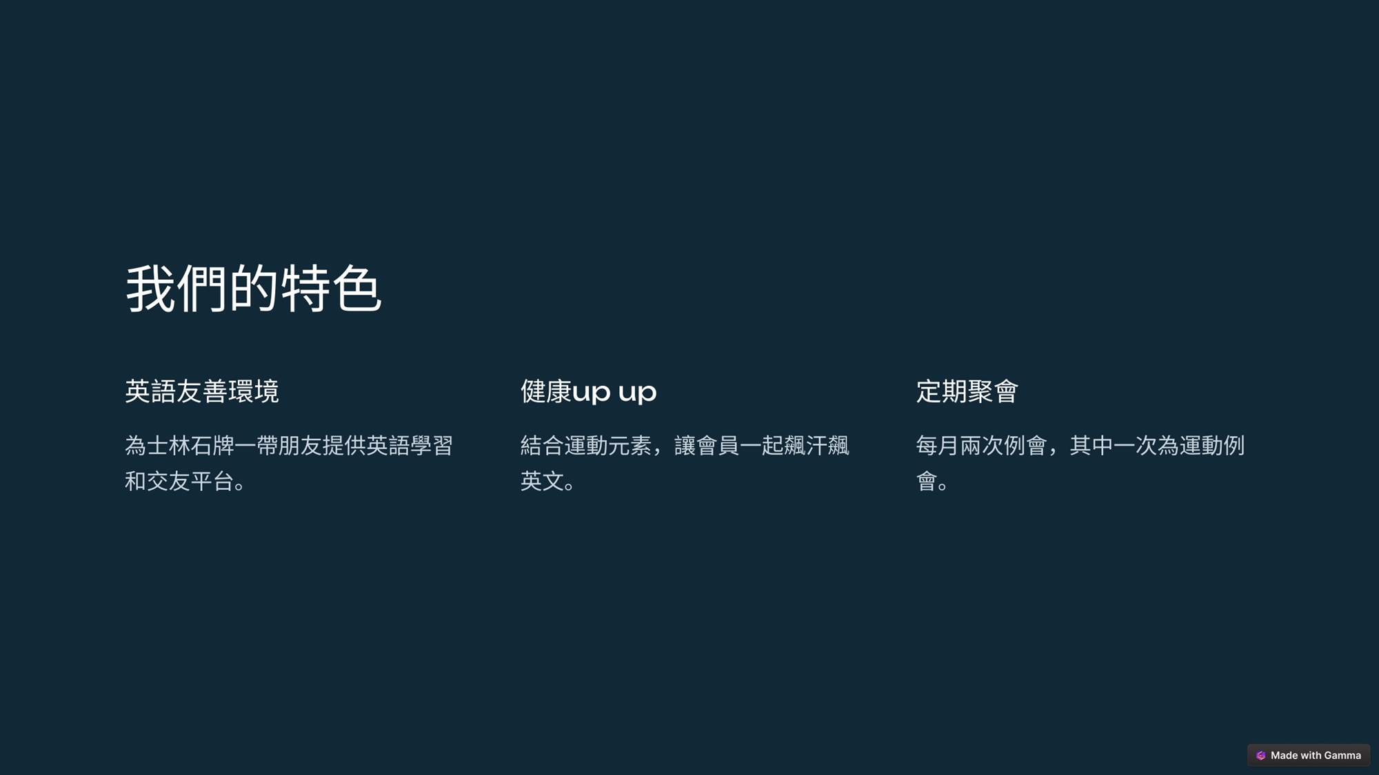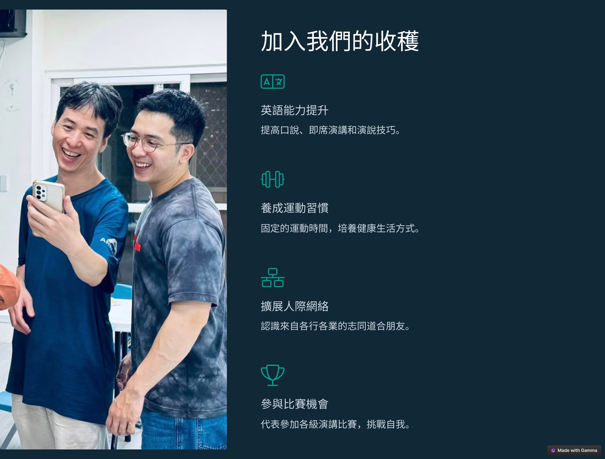 ★一個月兩次歡樂知性的英文交流及運動夥伴週四夜晚(第二/第四個週四—第四個為運動例會)