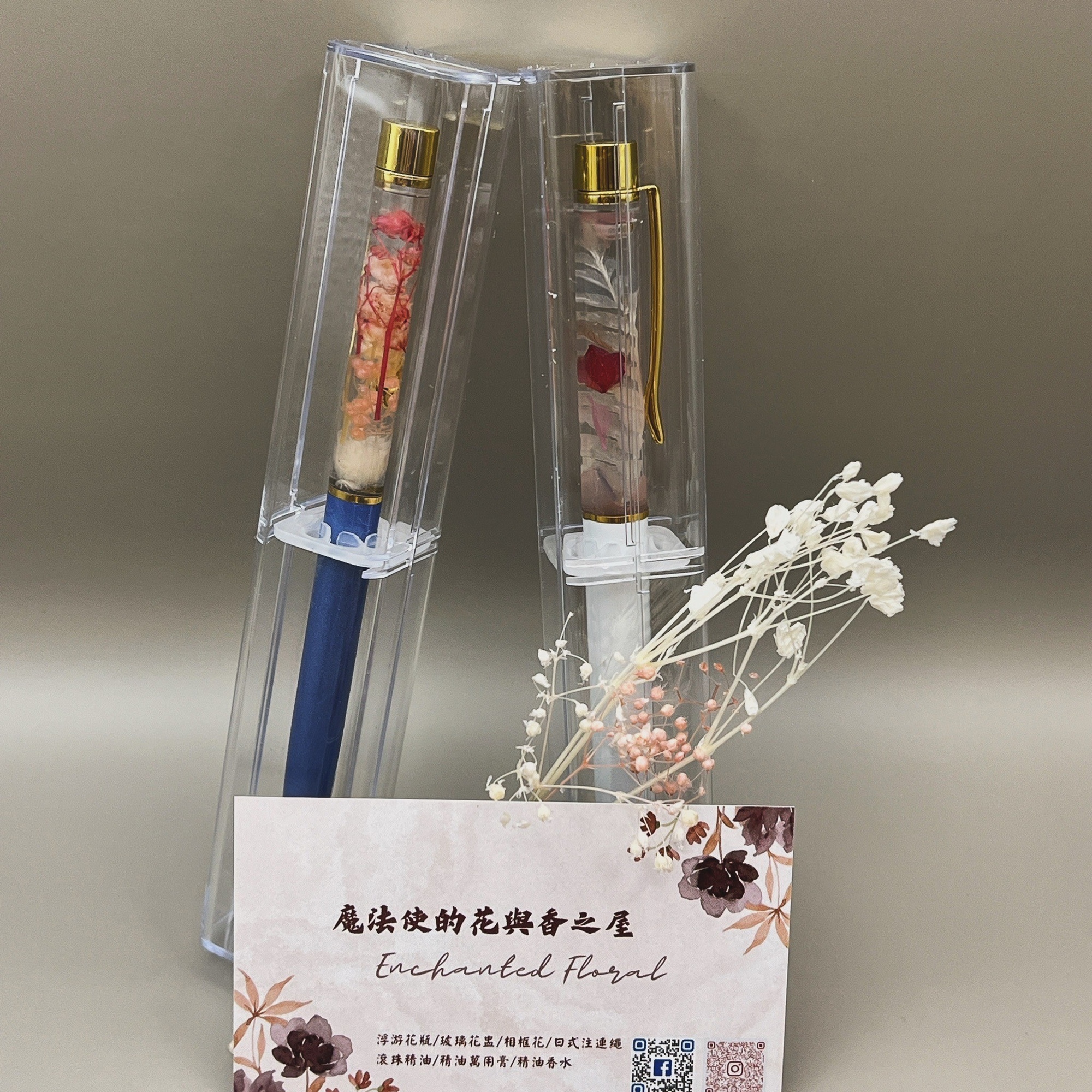 將永生花或乾燥花放入玻璃筆管並注入浮油花保存液,讓花草在筆管內漂浮綻放,根據個人的美感與喜好會堆疊出不一樣的氛圍,筆的顏色可挑選且筆芯亦可替換,非常實用也很適合送禮。