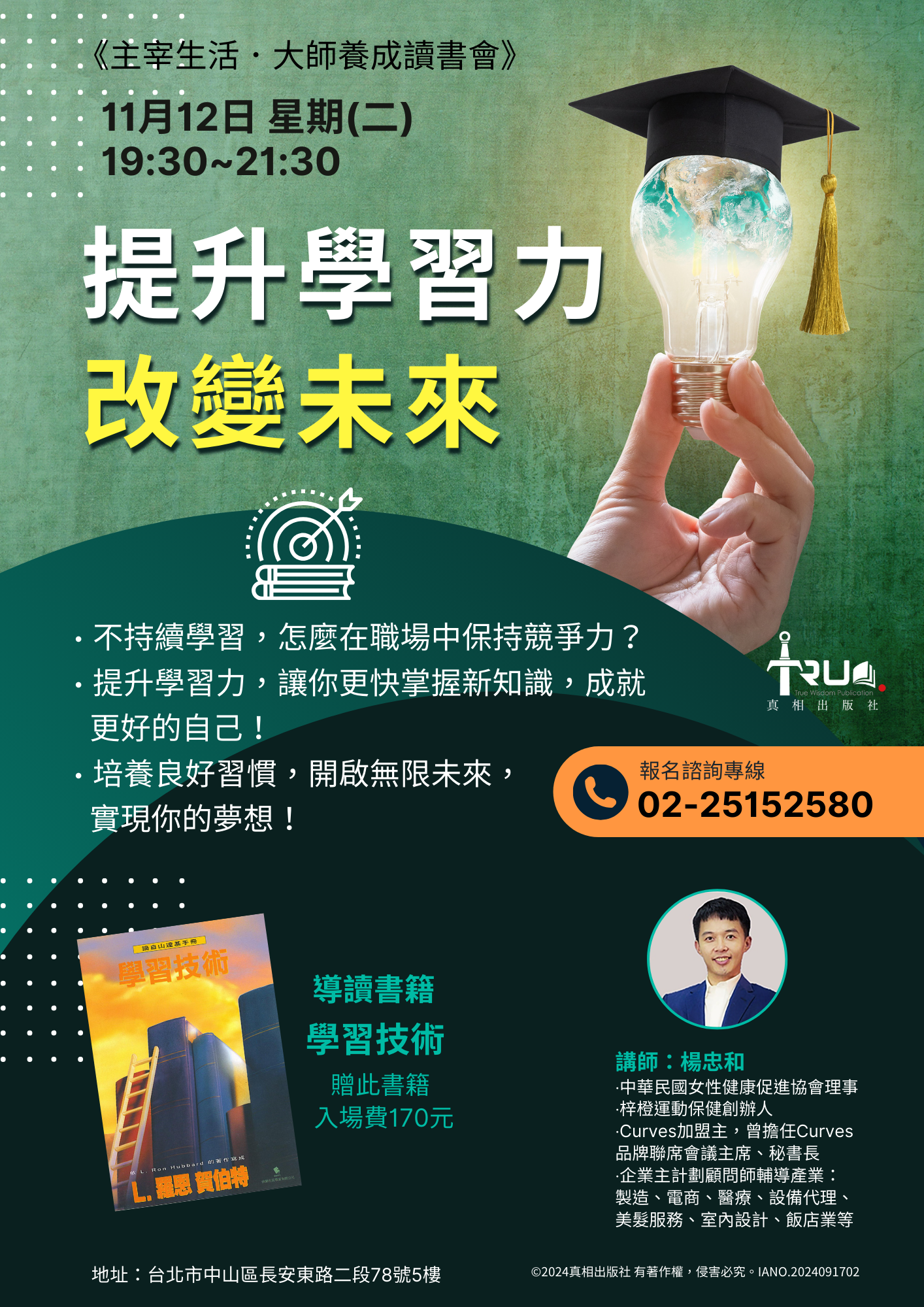 💖💖俗話說「生命,是不停歇的學習歷程。」大部份人都會同意,要想自我提升、改善生活,工作升遷或賺更多錢就要懂得學習,和應用所學的。但要如何獲得這種能力?將在此講座中解答!
