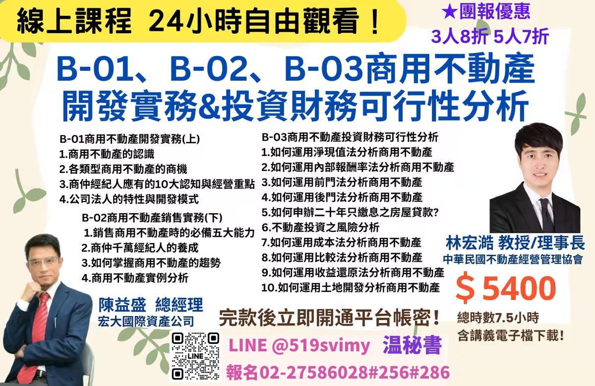 【線上課程】商用不動產 開發實務&投資財務可行性分析,線上價5400元!完款當天立即開通!