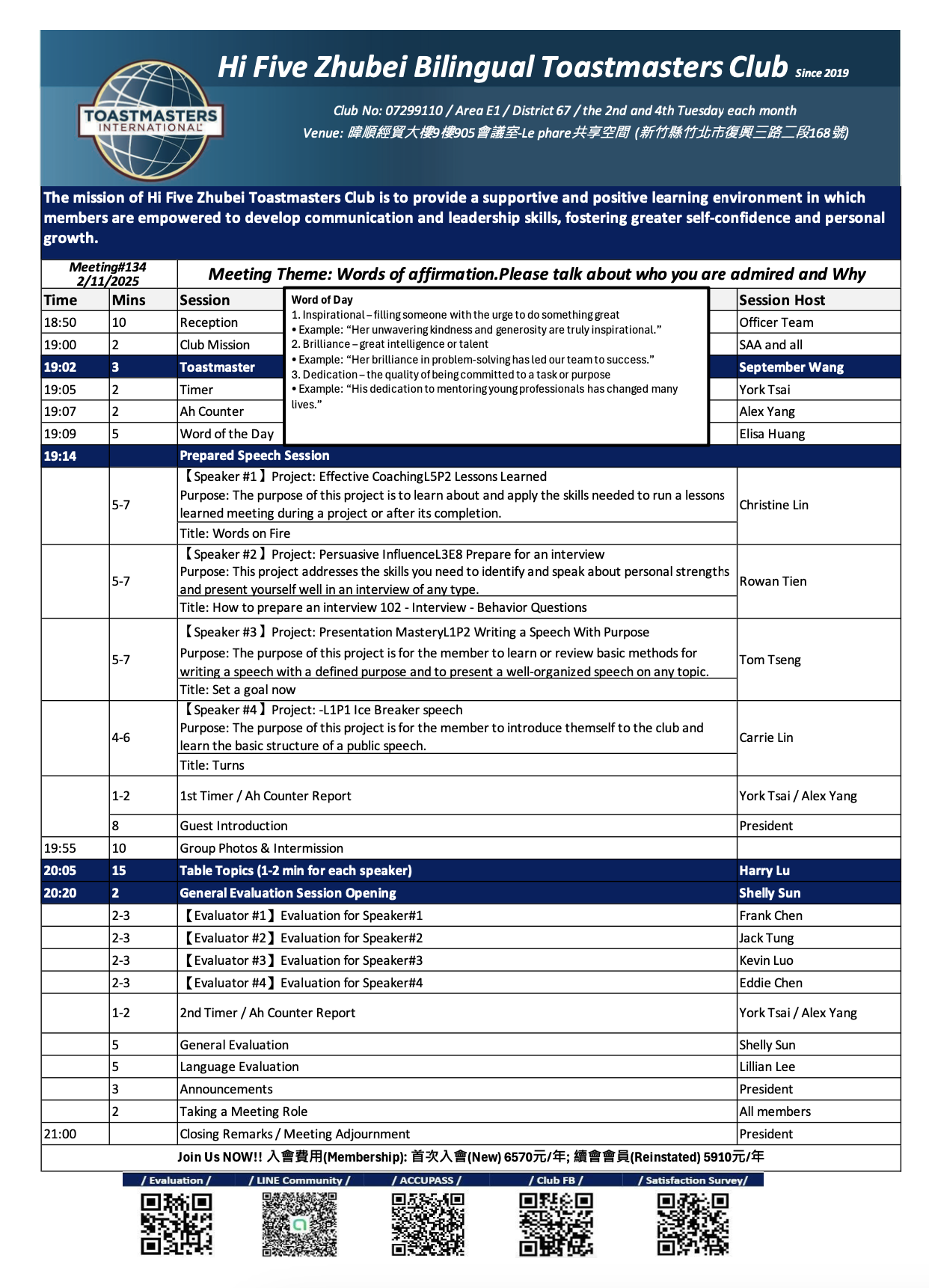 我們先以活潑有趣的氛圍進行著簡單的每日一字,隨後登場的是數位成員的獨秀(Prepared Speech),分享著各種不同主題的演講,例如環保、爬山、旅遊、職場經驗或是學習的小技巧等... 在聽完精彩的分享後就來個小茶點時間,大家吃吃喝喝聊聊天(Intermission),之後動態刺激的隨機即興分享(Table Topic)就登場了,主持人會準備一些題目讓大家能有機會上台臨時想要怎麼回答,短短一分鐘的腦力激盪~ 激情過後,當然就是有些沉澱地聽著講評員針對前面成員的演講做講評(Evaluation),就像歌唱節目般,可能會說"加油好嗎?",也可能會是"Bravo! 這是今年最棒的演講!"。最後,再來個實用的單字分享或是發音校正(Language Evaluation),會議就完美Ending了。