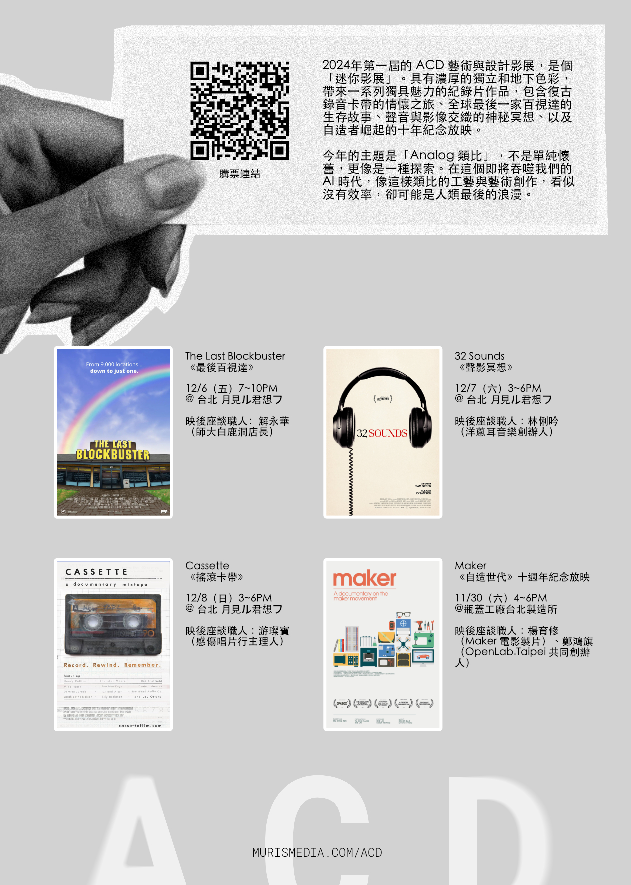 2024年第一屆的 ACD 藝術與設計影展,是個「迷你影展」。具有濃厚的獨立和地下色彩,帶來一系列獨具魅力的紀錄片作品,包含復古錄音卡帶的情懷之旅、全球最後一家百視達的生存故事、聲音與影像交織的神秘冥想、以及自造者崛起的十年紀念放映。
