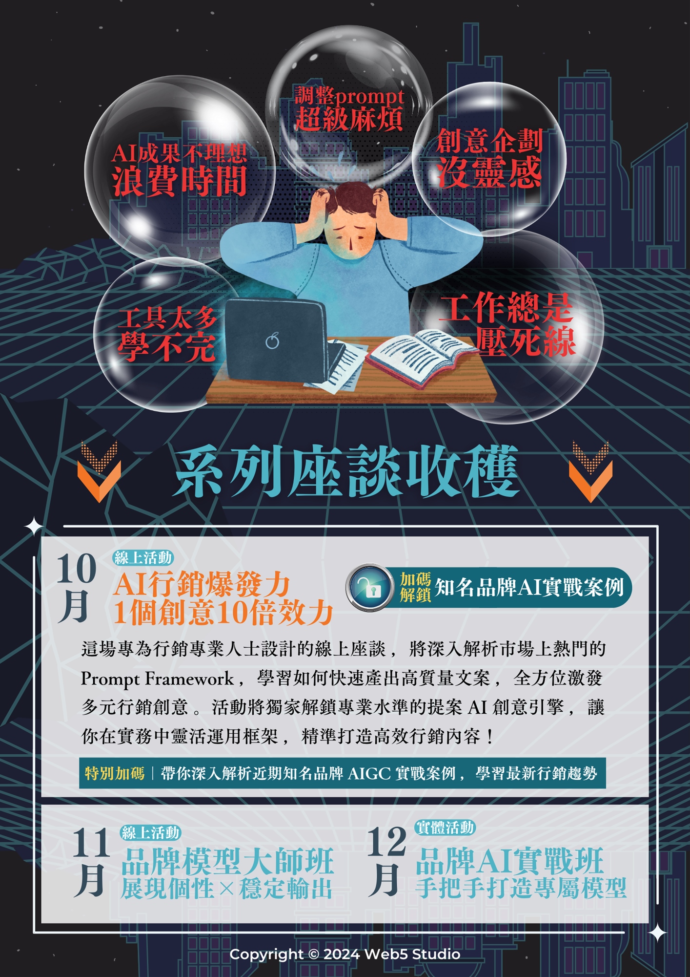 學習如何將 AI 融入創作流程,提升創意與靈感的輸出效率,並貼合品牌個性化的內容。