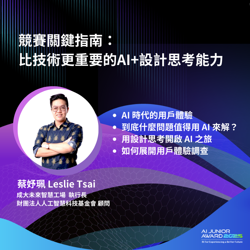 | 19:15 ~ 20:15 | 競賽關鍵指南:比技術更重要的AI+設計思考能力 |