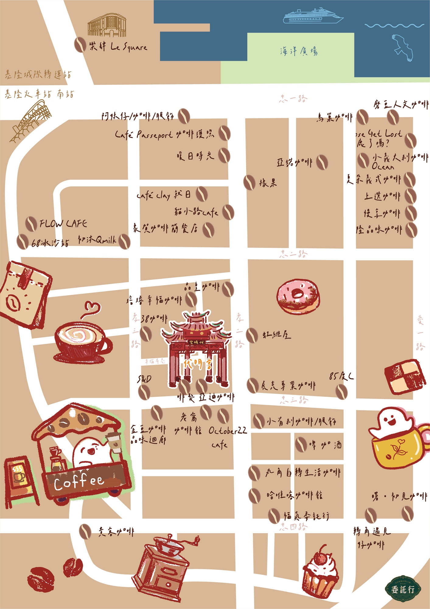 孝三路美食商圈(貓小路咖啡、橡果咖啡)->委託行商圈(老窩咖啡、虎克咖啡、丸角咖啡)->崁仔頂魚市(轉角遇見好咖啡)->仁愛市場(小恭禧咖啡)