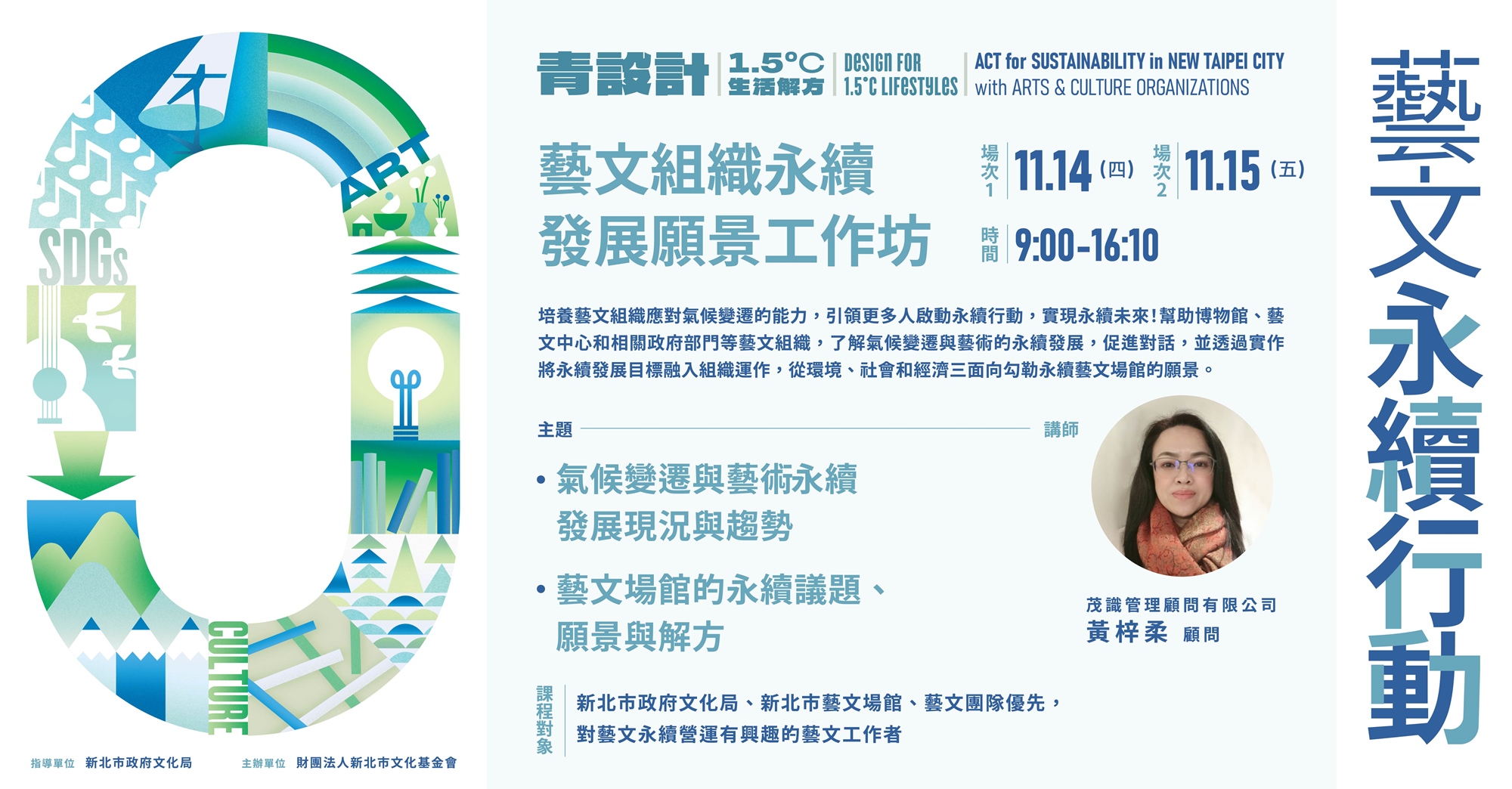 藝文組織永續發展願景工作坊,涵蓋氣候變遷與藝術永續發展現況與趨勢、藝文場館的永續議題、願景與解方。透過工作坊,培養藝文組織應對氣候變遷的能力,引領更多人啟動永續行動,實現永續未來!幫助博物館、藝文中心和相關政府部門等藝文組織,了解氣候變遷與藝術的永續發展,促進對話,並透過實作將永續發展目標融入組織運作,從環境、社會和經濟三面向勾勒永續藝文場館的願景,以及可能的解方。