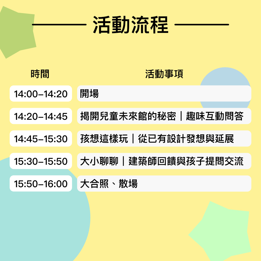 🔹 啟發與交流:孩子們將直接與軟體(展示)規劃、建築師團隊互動,了解兒童館每一層的主題與設計過程。在分享和問答討論中,孩子們不僅能學習到空間設計的概念,還能表達自己的創意和提問。