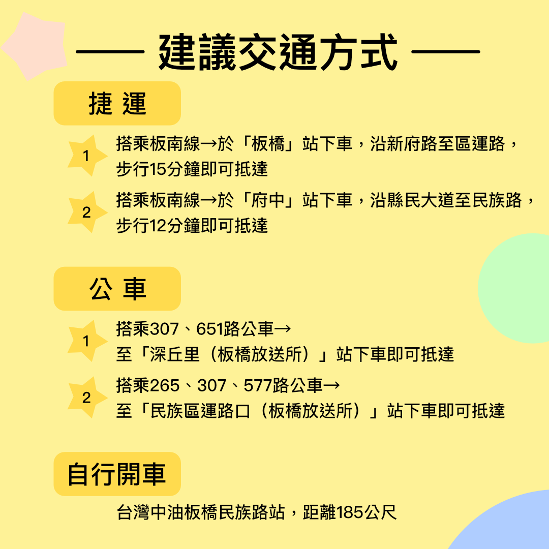 - 活動地點:板橋放送所 多功能展覽廳(地址:新北市板橋區民族路130巷67號)