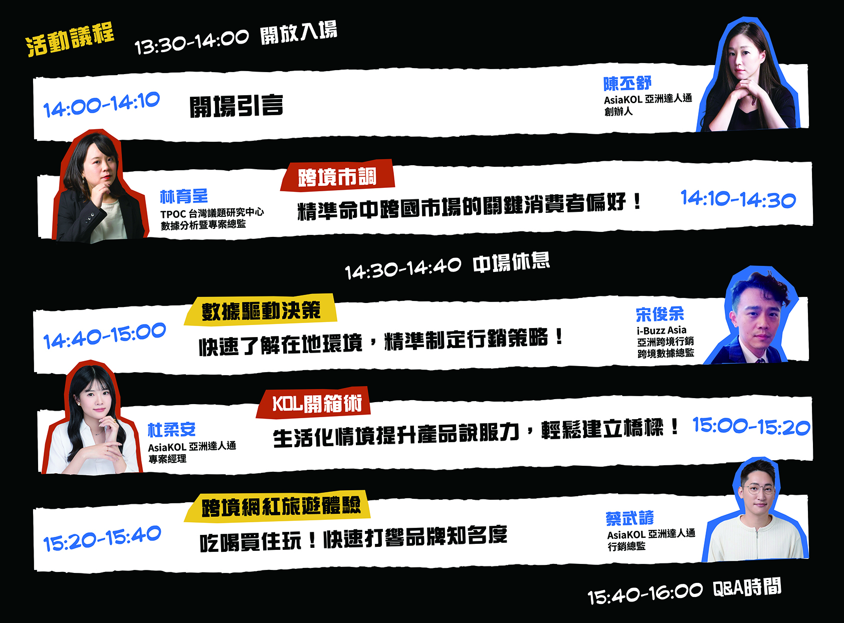不論是海外拓展還是引進台灣,講座將帶領您輕鬆掌握跨境行銷關鍵秘技!從 民調洞察 看穿消費者心思,到 數據策略 精準鎖定市場,再結合 網紅行銷 打造品牌熱度,助你突破文化隔閡,輕鬆開啟「入境+出海」的雙向成功! 🚀