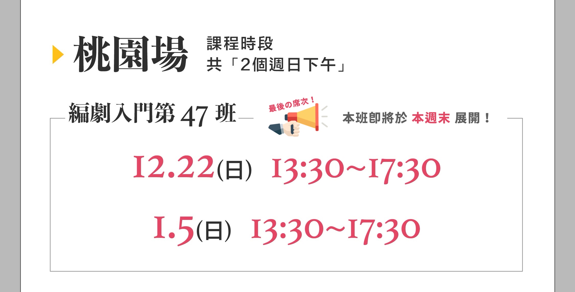 Q:請問《編劇入門》上課的時間是一共兩天的下午時段嗎?