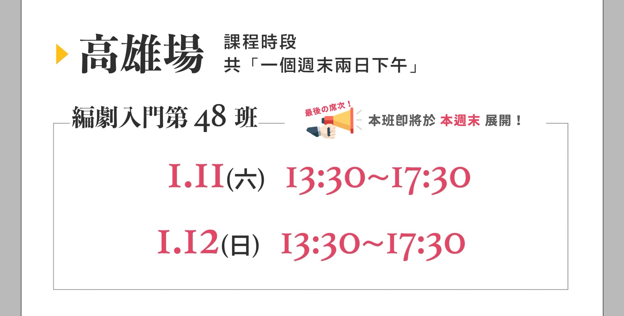 Q:請問《編劇入門》上課的時間是一共兩天的下午時段嗎?