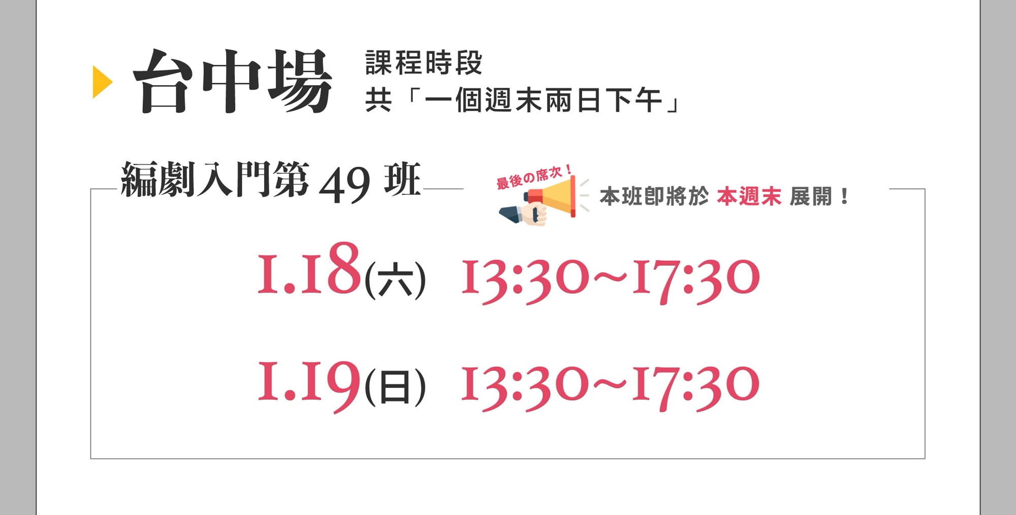 Q:請問《編劇入門》上課的時間是一共兩天的下午時段嗎?