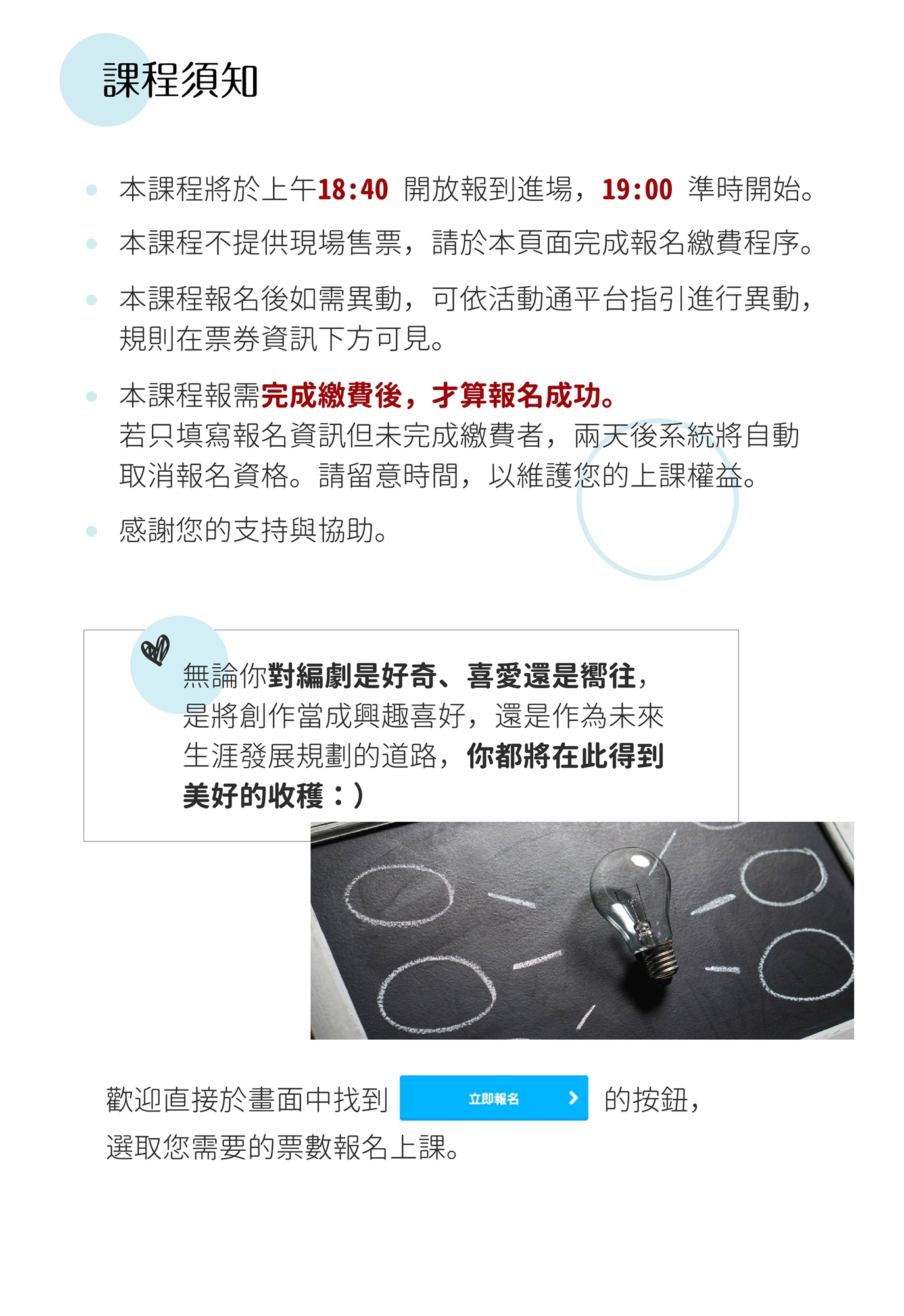 - 獨家贈送「2024編劇產業動態與工作解析」講座 掌握最新市場趨勢與創作機會,迅速將所學應用,開啟更多創作可能。這堂講座將引導您精準了解市場現況與需求,讓您的文字工作具備更高價值潛力,為未來創作鋪展更多潛在機會。