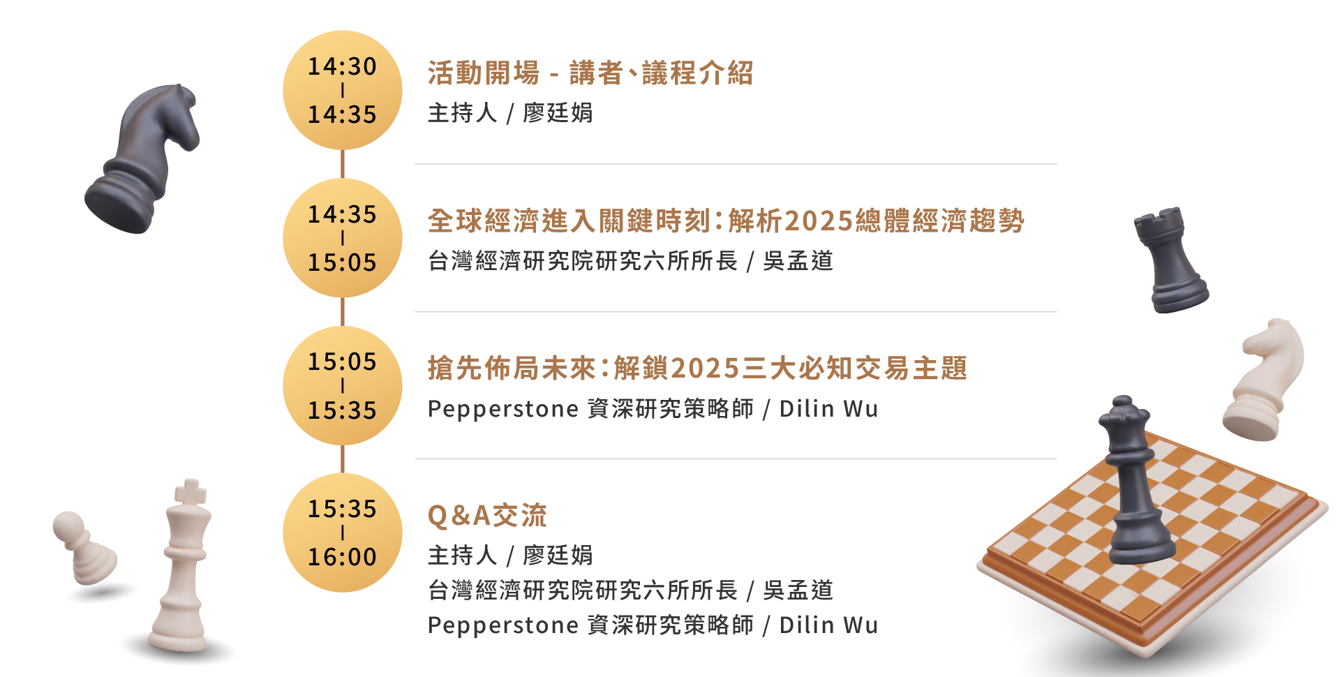 本場講座特別邀請知名財經主播 廖廷娟、台灣經濟研究院研究六所所長 吳孟道、Pepperstone 資深研究策略師 Dilin Wu,帶我們深入分析全球總體經濟情勢,並掌握2025必知的三大交易主題關鍵趨勢!