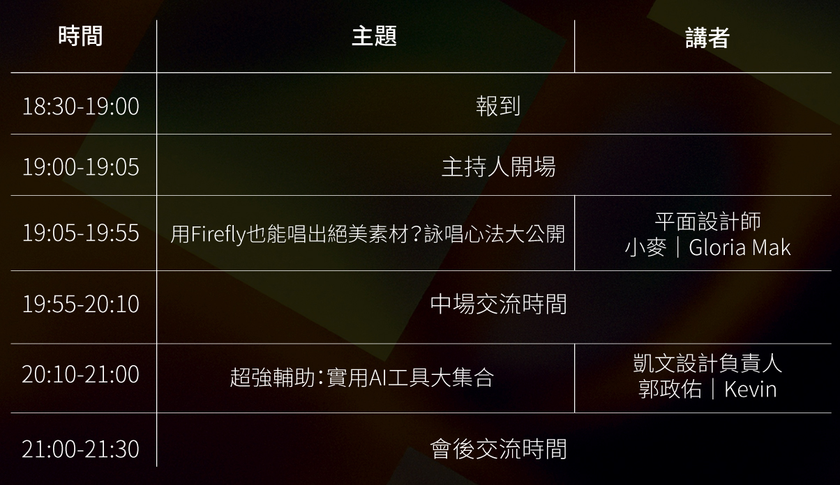活動時間:19:00 - 21:00(18:30 現場開放報到)