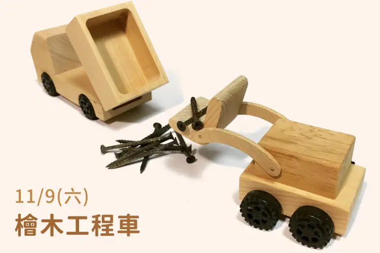 伴隨天然檜木香氣的小工程車,課程會透過簡單的切鋸、砂磨、組裝、塗裝等木工作業流程,體驗當個一日小木工,並帶回兩台自己手作獨一無二的香香工程車。