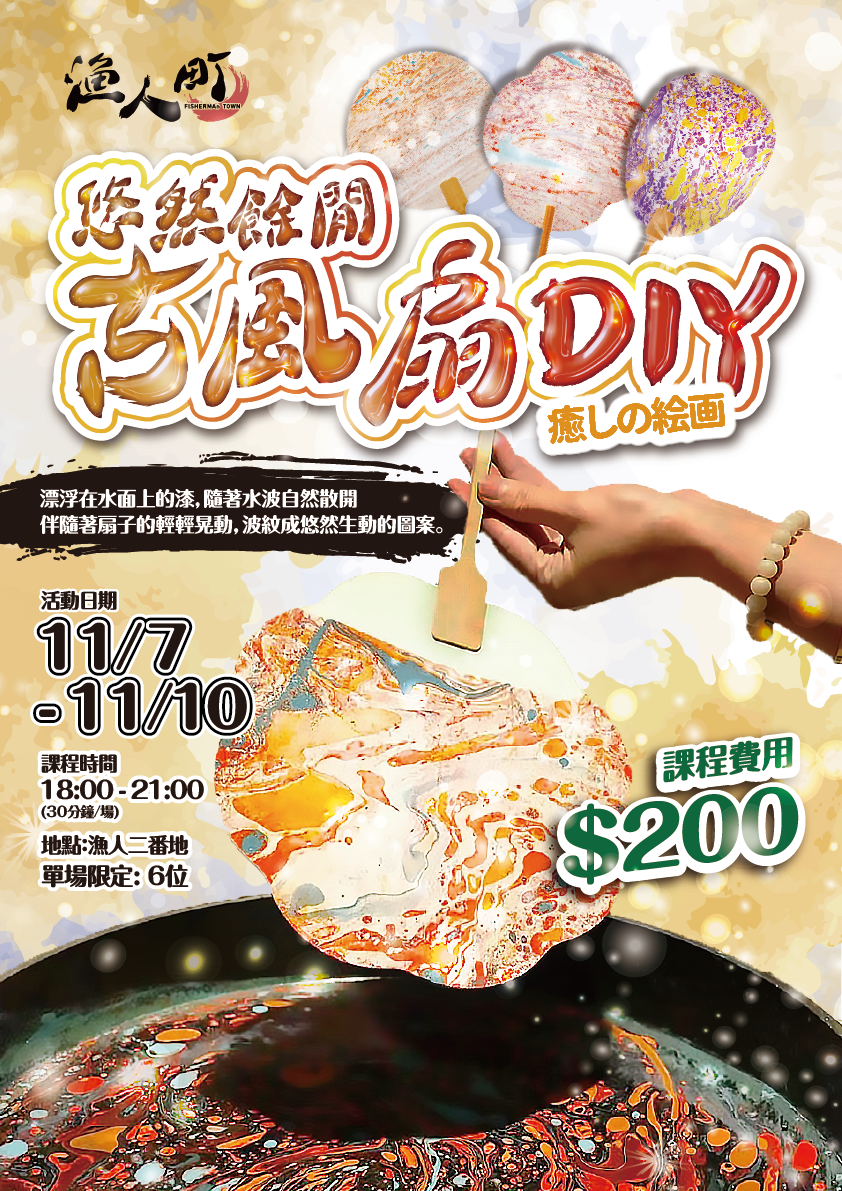 - 色彩選擇與創作 - 自由選擇顏色,將漆水倒入水面並撥動,創作出自然隨性的漆扇花紋。