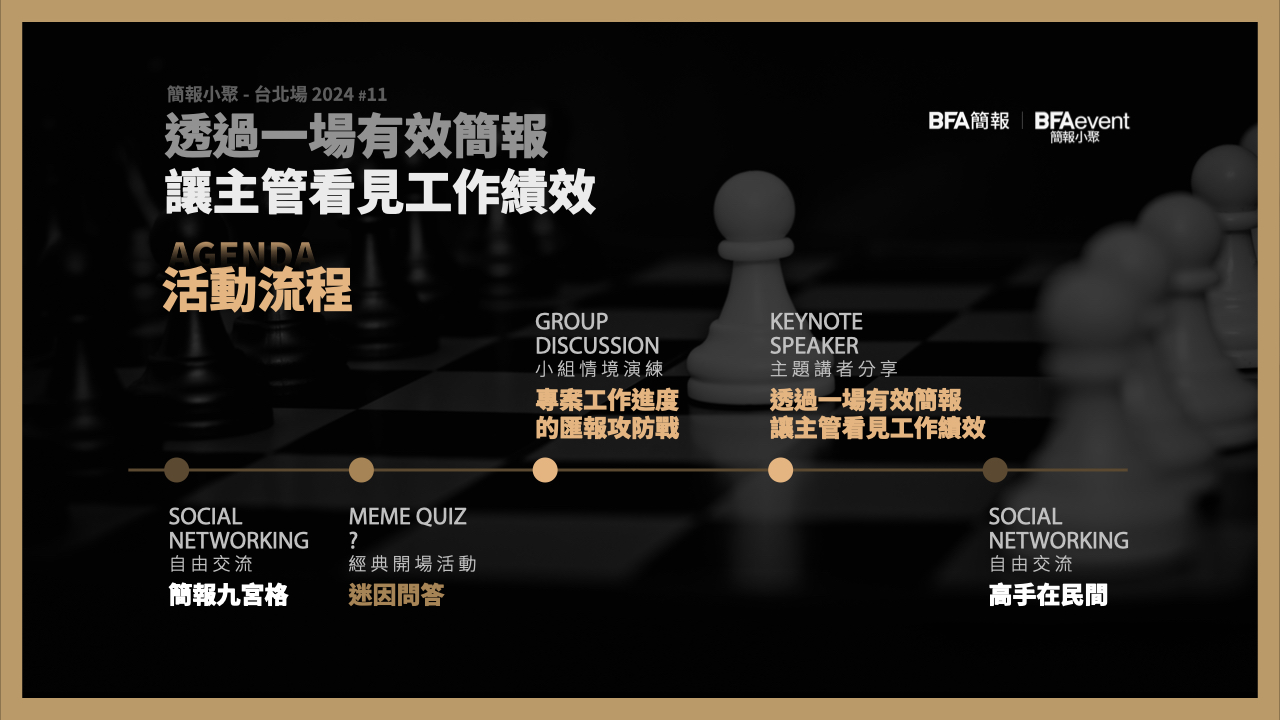 日常的工作裡,每週每月總有那麼幾刻,需要向主管匯報工作成果,可能是專案進度、可能是營業數據、也可能是全新的企劃提案,本月簡報小聚邀請特邀講者及駐場簡報人,和大家分享如何透過一場有效簡報,讓主管看見工作績效。