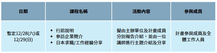本次計畫擬邀請在日工作者進行日本求職經驗分享與資源連結,讓計畫學員提前了解如何融入或適應日本的職場文化,並善用自身優勢,發掘更多日本求職可能。歷屆邀請在日職人任職公司:日本樂天旅遊、LINE、黛安芬日本分公司、ZemaxJapan株式會社、日本KAYAC創意總監、Ruleless Studio 創辦人等。