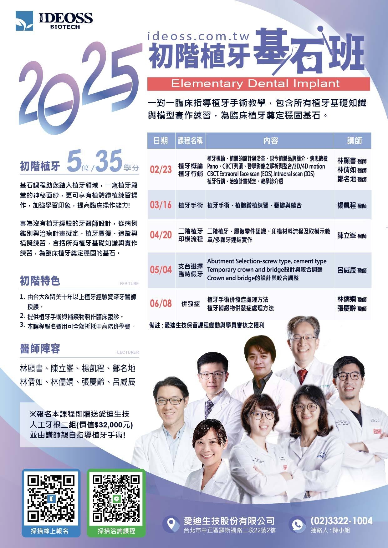 - 如欲深研植牙領域,本課程報名費用可全額折抵中高階班學費