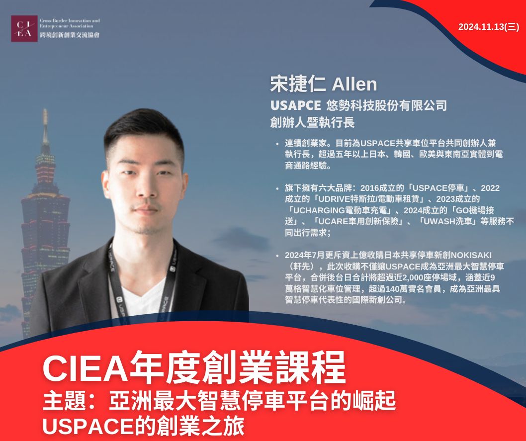 十一月!我們隆重邀請 連續創業家,USPACE共享車位平台共同創辦人兼執行長 宋捷仁 Allen 來分享,主題:“ 亞洲最大智慧停車平台的崛起:USPACE的創業之旅 ”,分享Allen三度創業,到目前的企業經營心路歷程。