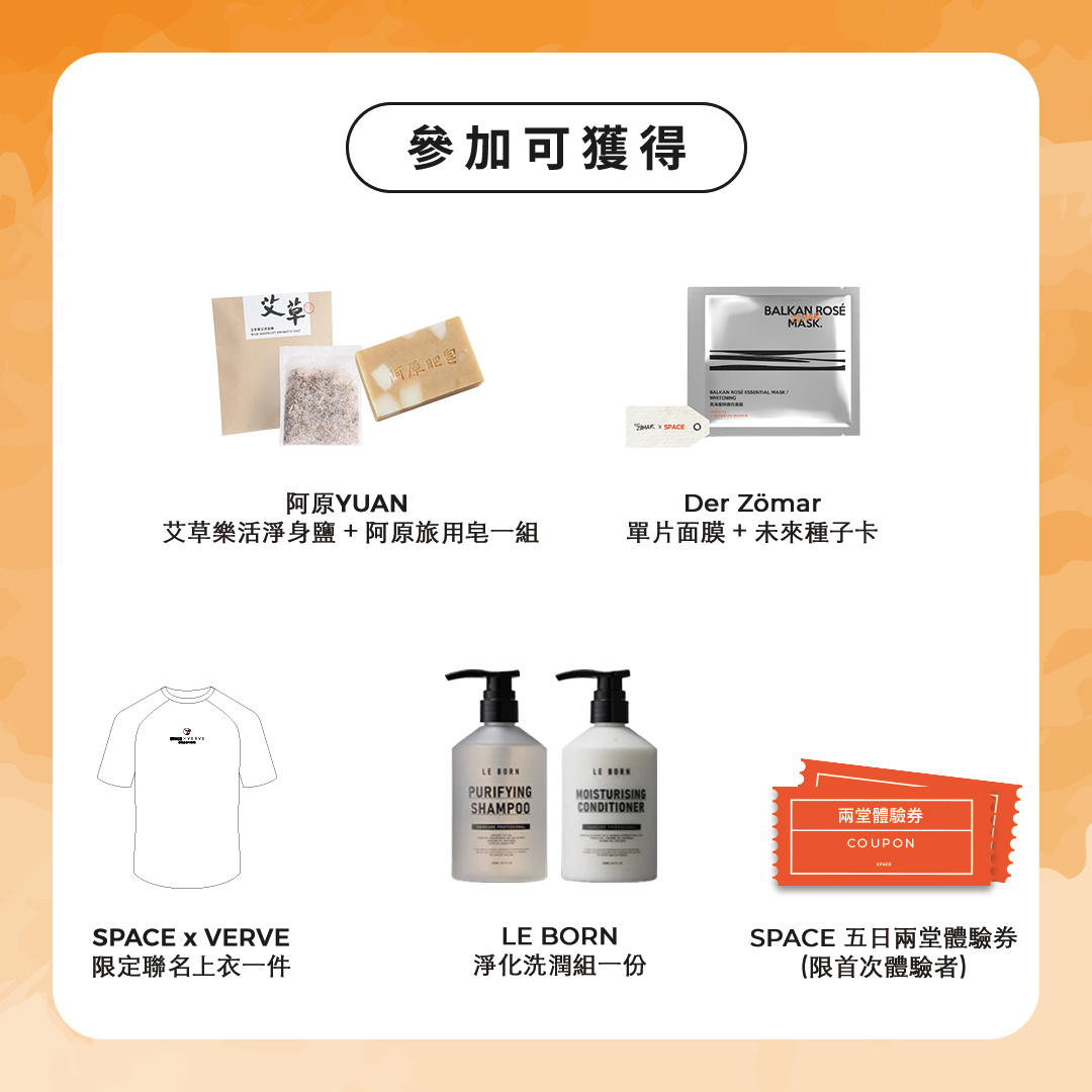 - 活動當日簽到時領取並鼓勵您穿著 SPACE x VERVE 聯名上衣參加活動。