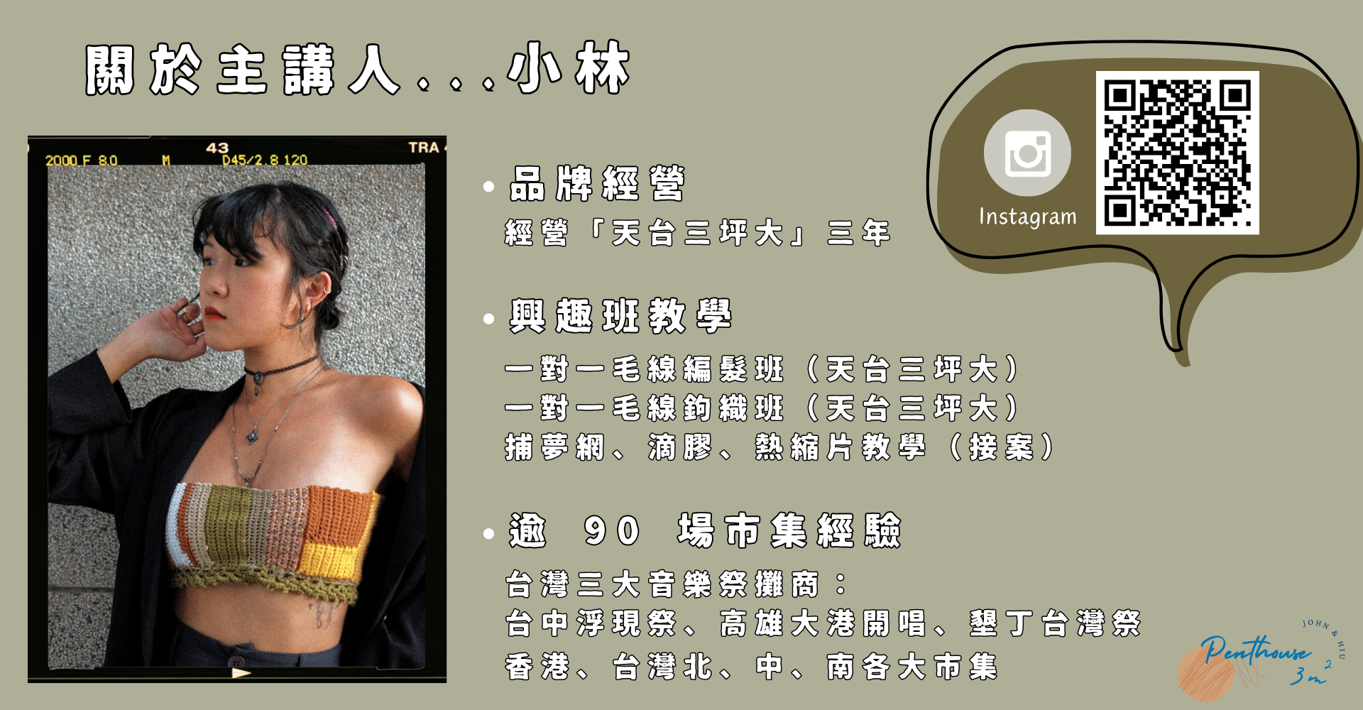 經營三年鉤織品牌【天台三坪大】,親手製作近 1000 件獨一無二的織品,參與過台灣北、中、南、香港逾 90 場巿集,在 2024 年成為台灣三大音樂祭攤商,說不定我們曾有一面之緣。