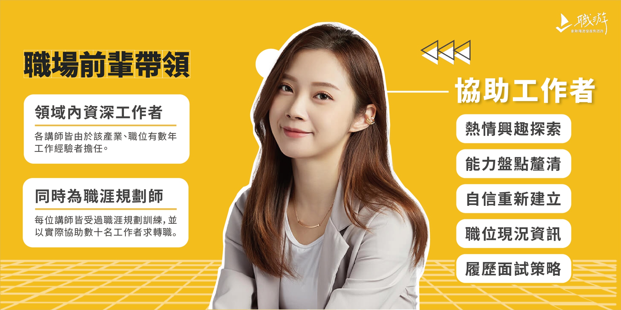 每場次工作坊,都是經由職游受訓過的職涯規劃師,並在該職位、產業領域內,有多年經驗的資深工作者,同時具有一線 Know-How,及專業助人能力,能協助工作者釐清自己的興趣、熱情、能力,並在重新設立目標、建立信心後,透過實際履歷面試策略的分享,提升取得理想工作機會的勝率!