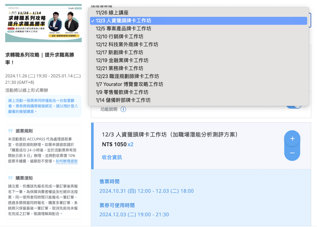 於點擊報名後,可於上方「請選擇票種」欄位,點擊欲報名工作坊場次,並可同時查看各方案詳細說明。