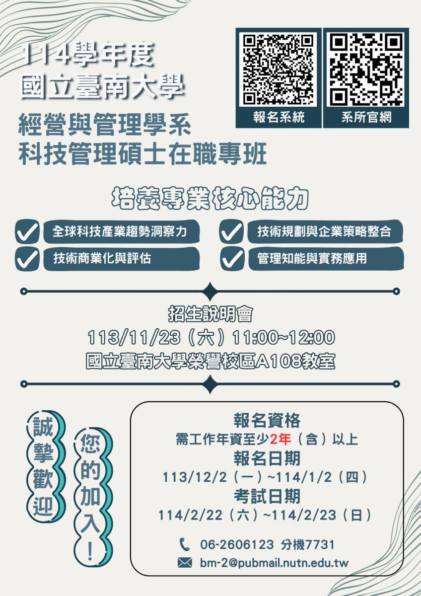 國立臺南大學114學年度經營與管理學系科技管理碩士在職專班招生說明會