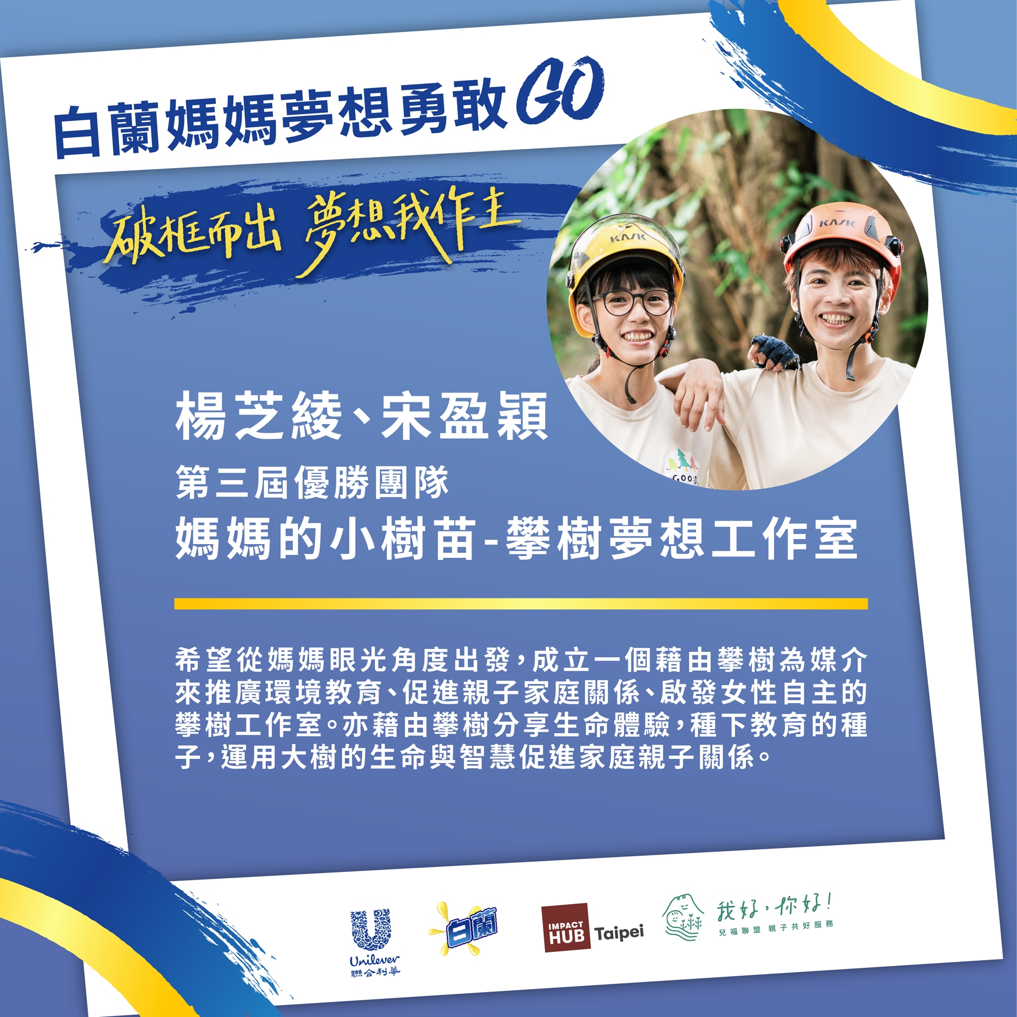 2020 年白蘭與 Impact Hub Taipei 共同發起「白蘭媽媽夢想勇敢 GO」追夢計畫,徵求媽媽的夢想提案,提供客製化課程、夢想導師諮詢等幫助,至今已收到超過 180 件夢想投稿、經歷超過 100 小時培力時數、陪伴共 25 組媽媽勇敢追求自我。