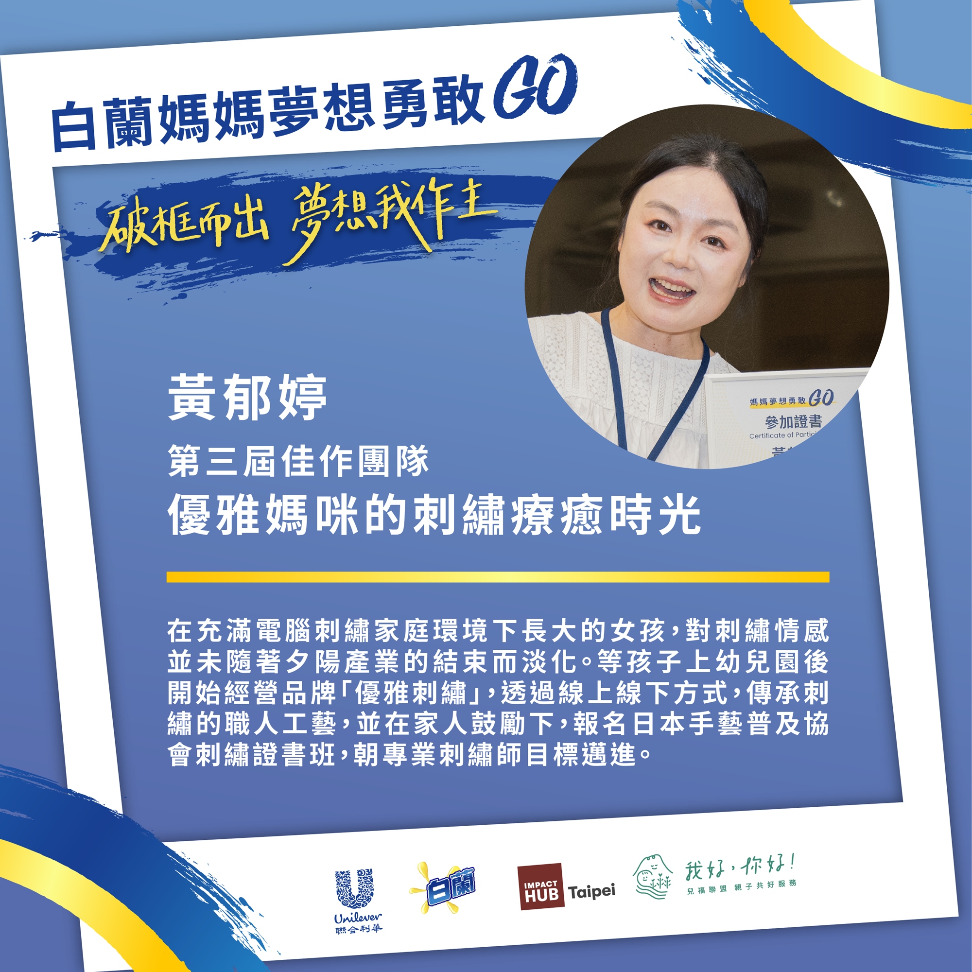 在本次徵件說明會,我們將介紹整體計畫內容,並一步步指導如何申請夢想提案,此外也邀請到第三屆計畫優勝團隊「媽媽的小樹苗-攀樹夢想工作室」分享她們的勇敢故事、參與計畫的學習心得與最大的收穫。在活動最後環節,參加者還能體驗由第三屆佳作團隊「優雅媽咪的刺繡療癒時光」帶來的手作刺繡,在這個專屬於「媽媽」的時光,好好放鬆療癒,為自己的夢想加油打氣!