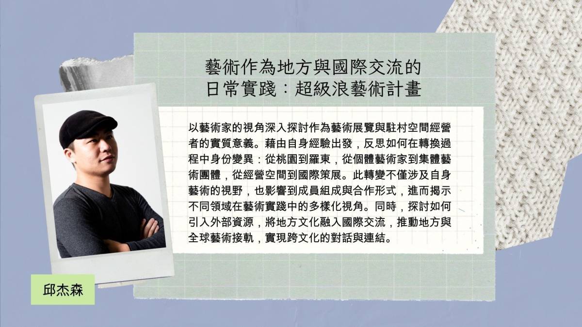 13:30-13:50 | 主題分享 | 藝術作為地方與國際交流的日常實踐:超級浪藝術計畫 | 邱杰森 |