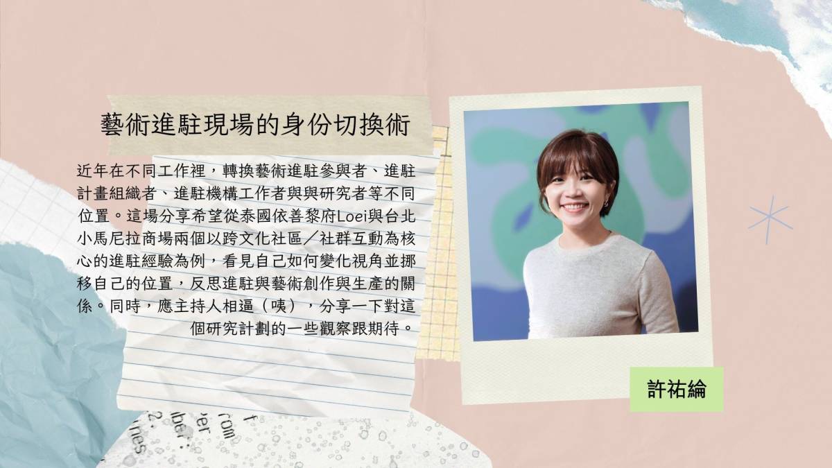 15:30-15:50 | 主題分享 | 藝術進駐現場的身份切換術 | 許祐綸 |