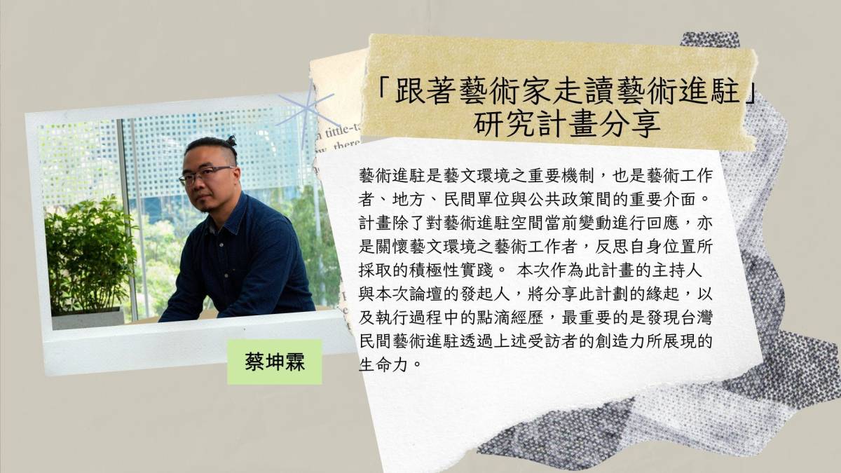 15:50-16:10 | 「跟著藝術家走讀藝術進駐」研究計畫分享 | 蔡坤霖 | |