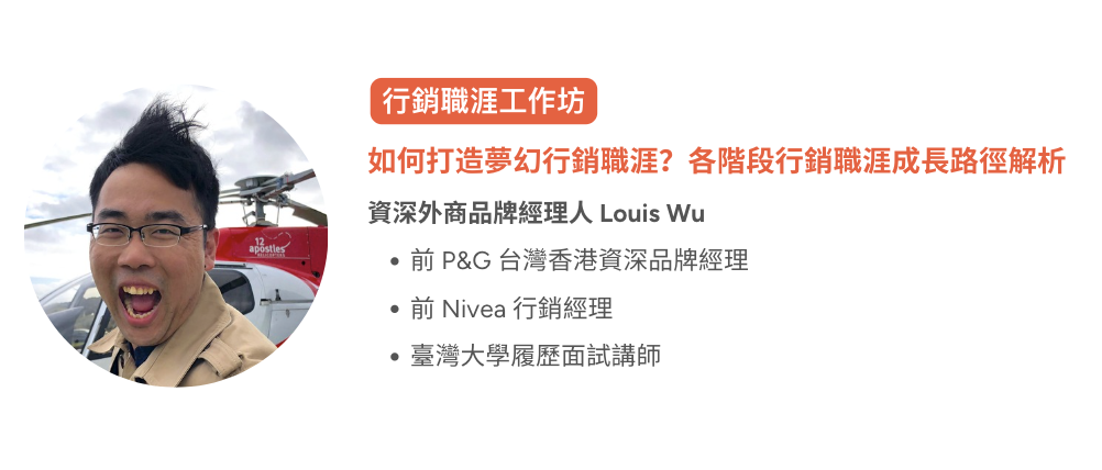 🎯 行銷職涯工作坊|超過 10 年 FMCG 品牌行銷主管經驗!外商品牌經理人 Louis Wu 現場剖析行銷產業趨勢,並透過個人行銷職涯的成長關鍵與選擇分享,為有意加入電商及行銷產業的求職、轉職者領路!