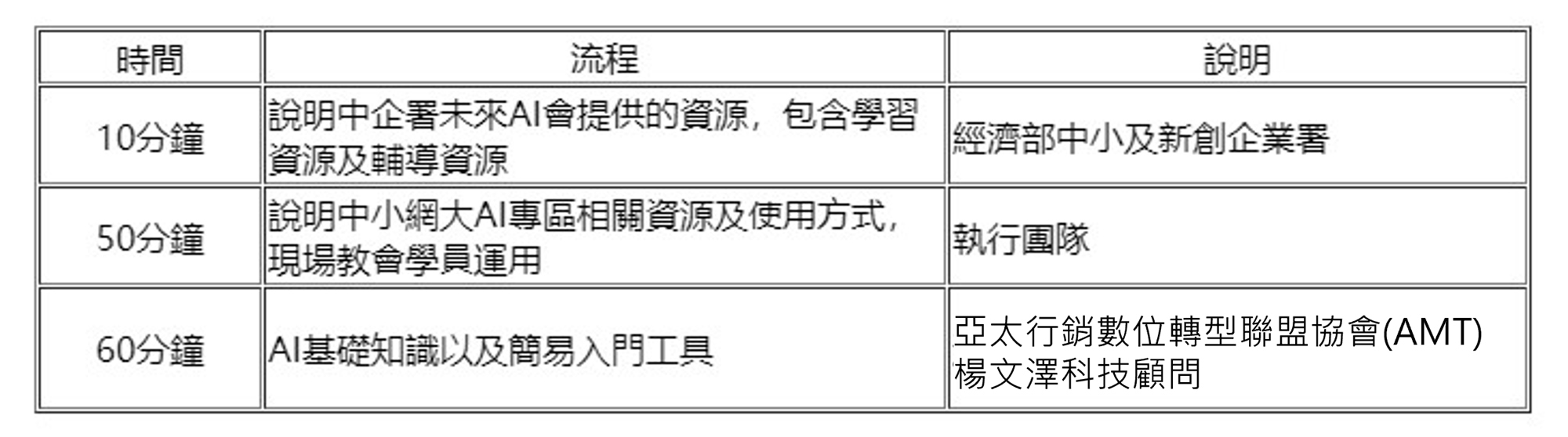 本次工作坊旨在培養「AI推廣志工」,藉由深入淺出的課程設計,幫助志工們掌握AI在中小企業應用的基礎知識,並熟悉中企署提供的各類AI相關資源。課程內容涵蓋三大主題: