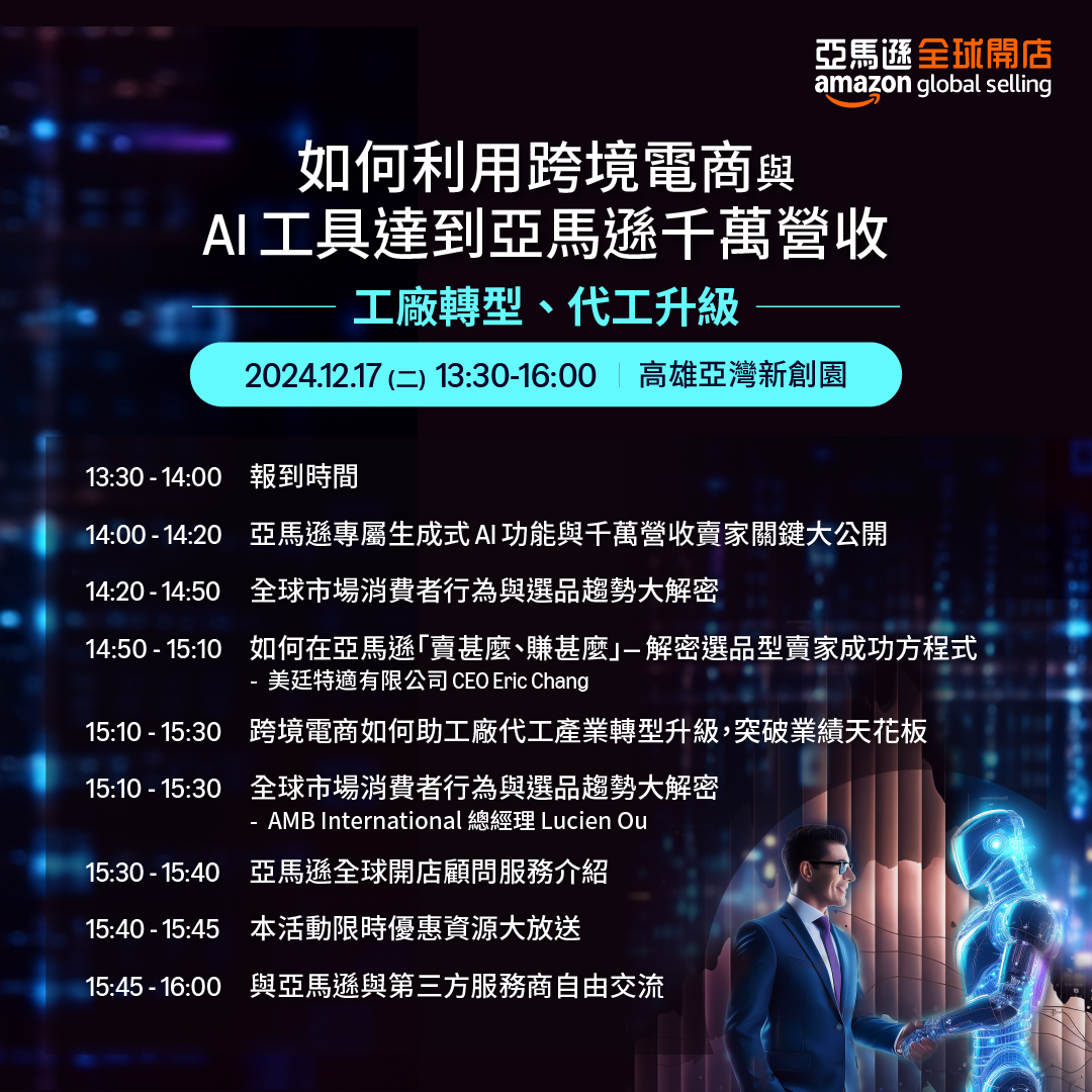 本活動中,台灣亞馬遜官方除了公開成為千萬業績大賣家的關鍵行動,也將分享在北美、歐洲、日本、澳洲、新加坡、中東的消費者習性與熱賣趨勢。另外,此活動也邀請業界知名的代營運服務商與成功賣家一起對談貿易型賣家與工廠型賣家成功的關鍵。最後,會在當場分享「企業海外陪跑計畫 5.0」 & 亞馬遜新銳品牌加速器 & NSI 等優惠🚀✨