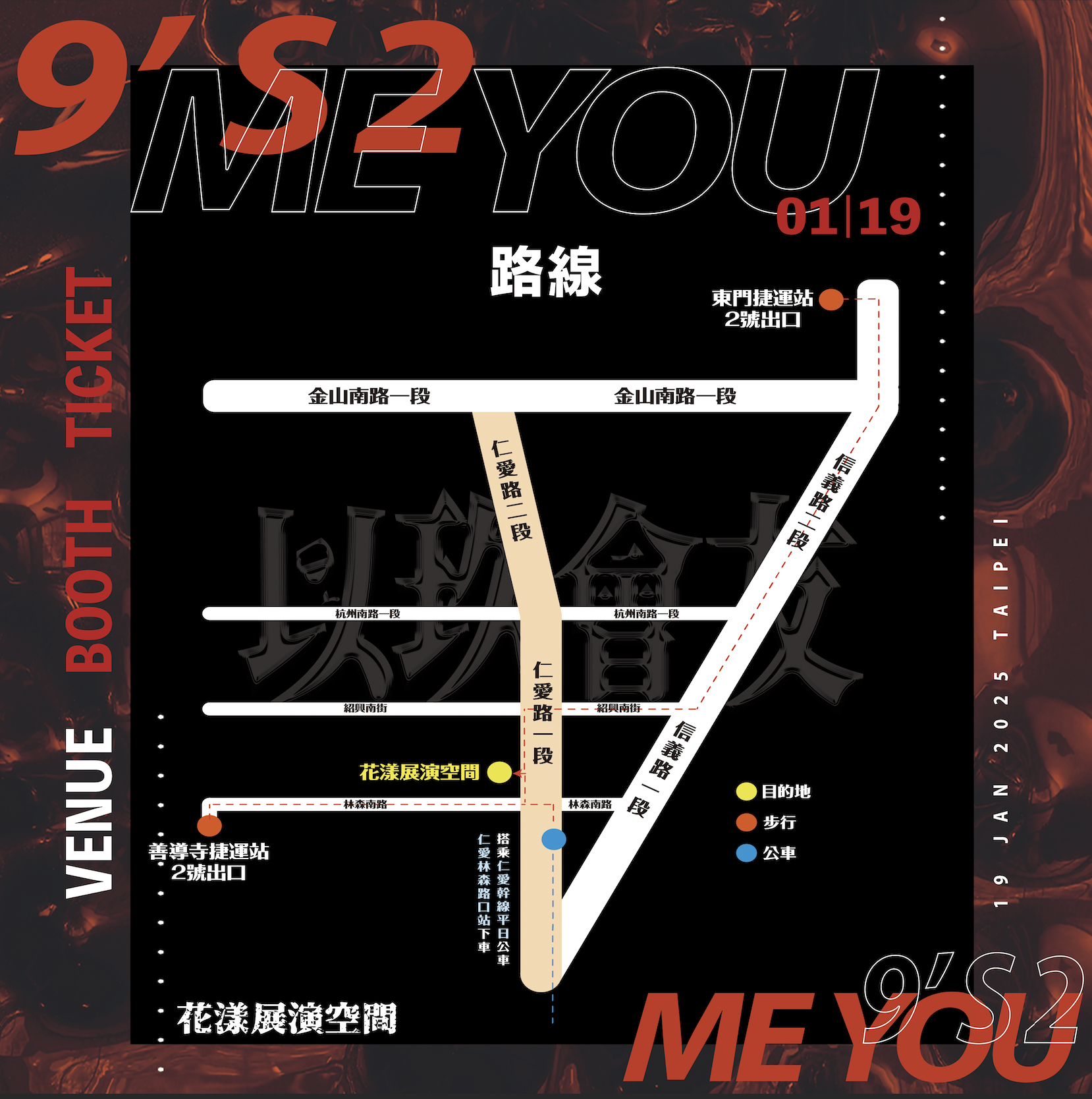 - 10 分(9 個停靠站),仁愛林森路口下車,步行約 2 分, 120 公尺,抵達花漾展演空間