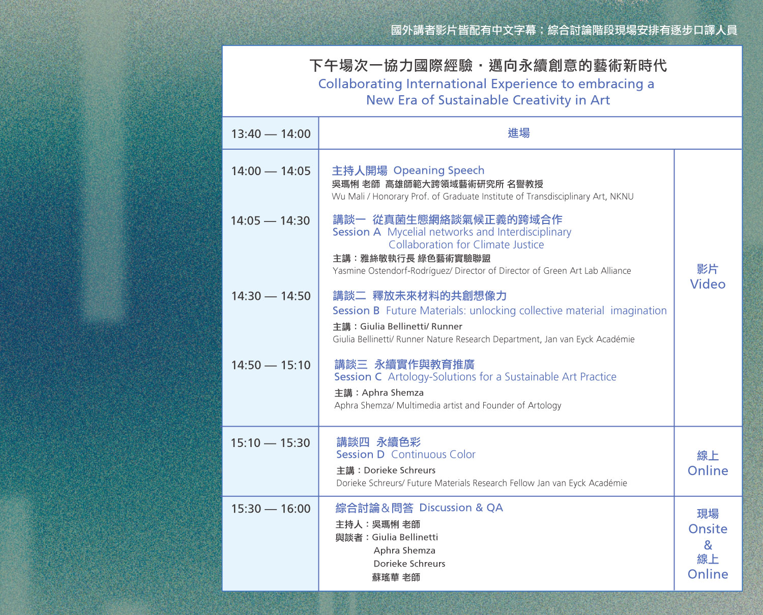 邀請國際上致力於推動綠色藝術活動及永續創作媒材的藝術組織工作者、研究人員及藝術家分享在藝術媒材、創作流程各環節推廣實踐藝術永續的心得見解,激發臺灣藝術圈的創意作為。
