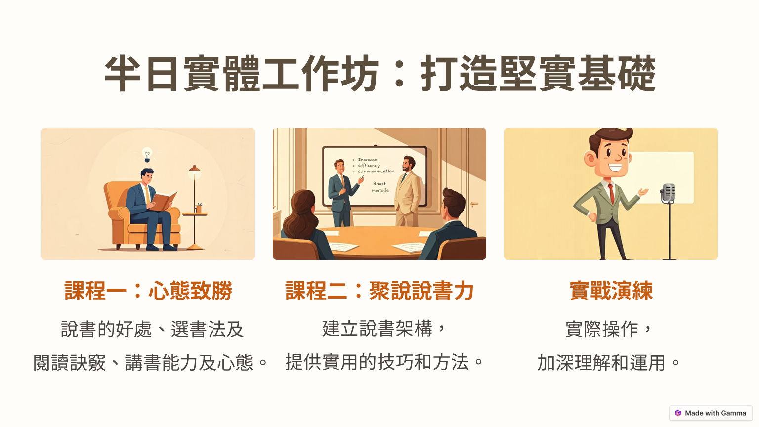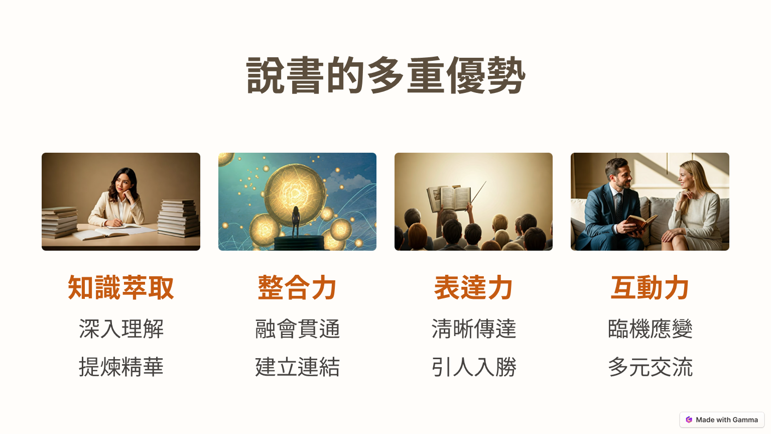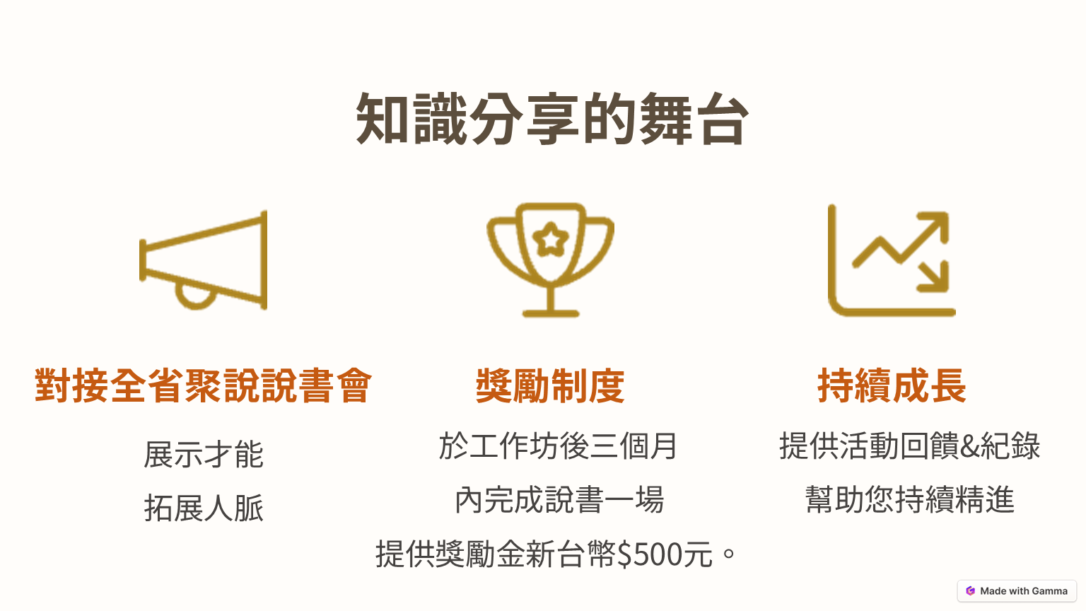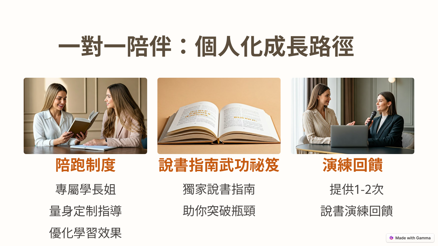 ► 【聚說說書力】:與說書成功有約,協助您架構說書,完善錦囊妙招 (含設計產出)
