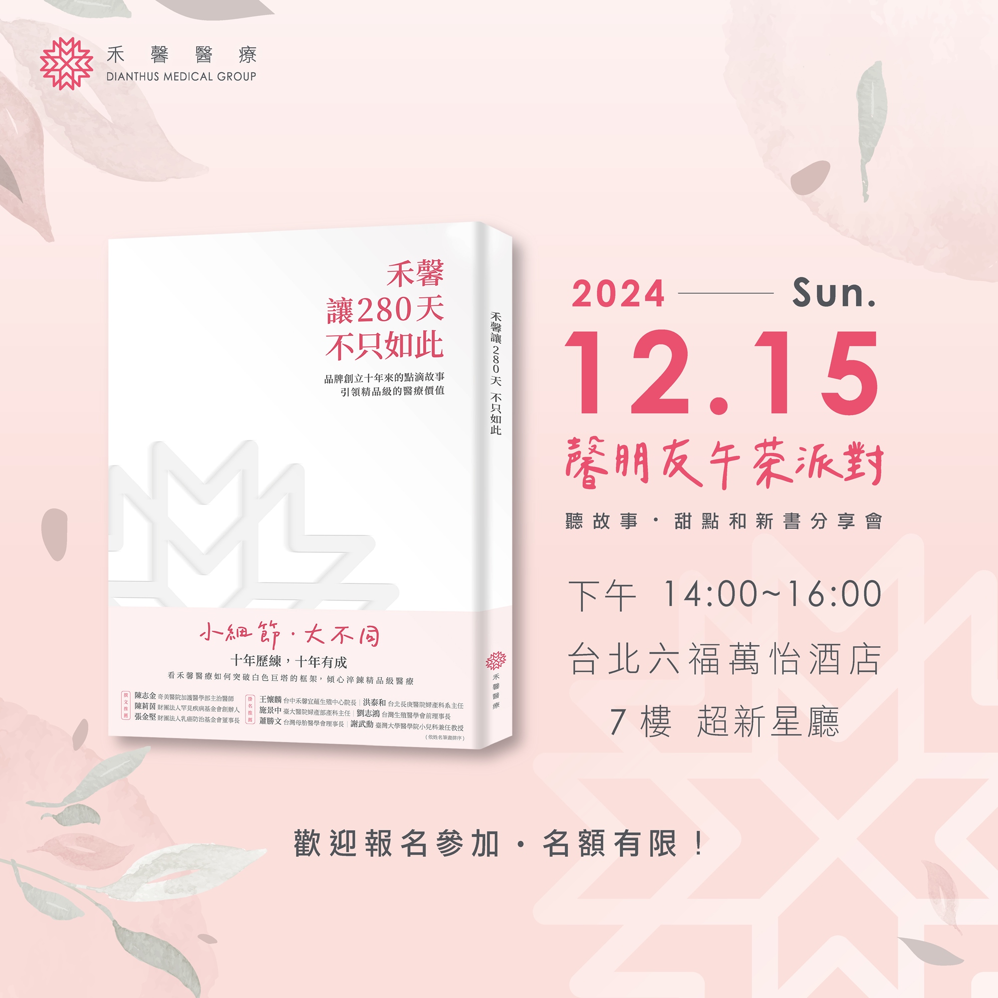 愉快優雅的午茶聚會,除了蘇醫師、陳保仁院長將到場分享禾馨醫療一路走來的茁壯變化與制度創新,還有許峻睿院長、徐碩澤院長、林賀典主任也會上台和大家輕鬆談心也談馨