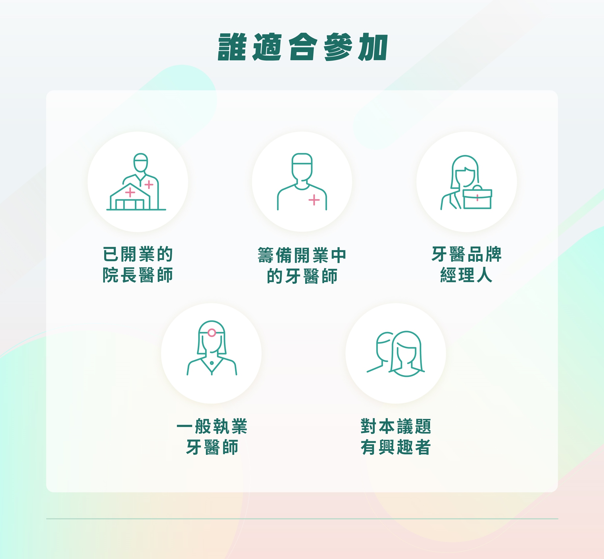 - 診所經理人,想了解他人的診所品牌經營策略、決策路徑。
