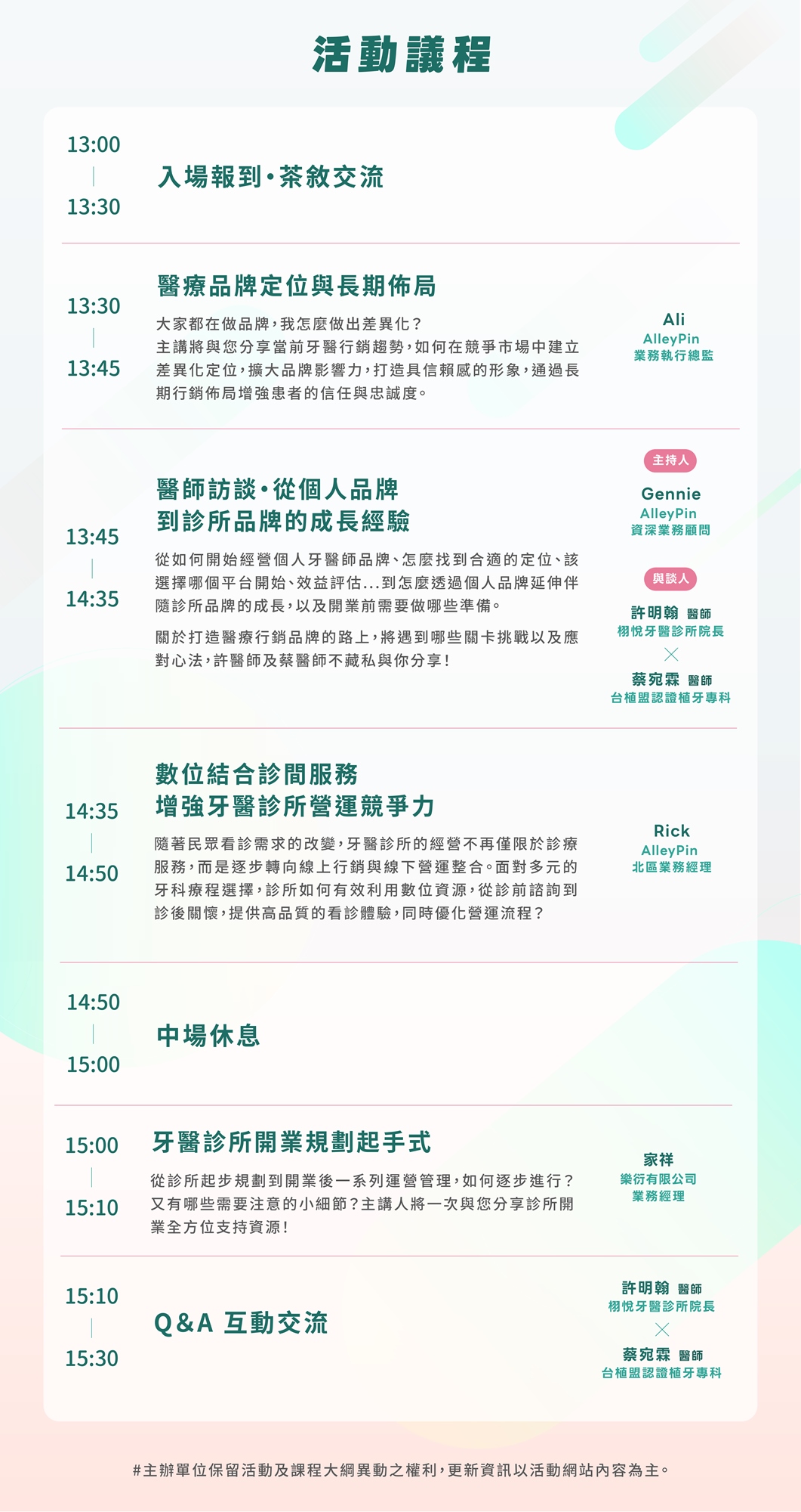 1. 免費活動名額有限,將以【 牙醫診所院長 / 經理人或產業相關 】為優先邀請對象,採審核制,敬請見諒。報名成功後,主辦單位將在 3 天內審核完畢,並將審核結果寄至您的 Email 信箱。收到審核通知信,即為報名成功。若您對報名或審核進度有疑問,歡迎來信 marketing@alleypin.com,謝謝!