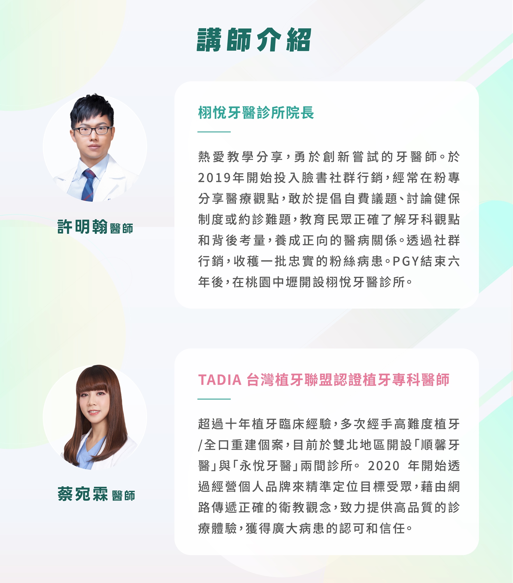 熱愛教學分享,勇於創新嘗試的牙醫師。於 2019 年開始投入臉書社群行銷,經常在粉專分享醫療觀點,敢於提倡自費議題、討論健保制度或約診難題,教育民眾正確了解牙科觀點和背後考量,養成正向的醫病關係。透過社群行銷,收穫一批忠實的粉絲病患。PGY結束六年後,在桃園中壢開設栩悅牙醫診所。
