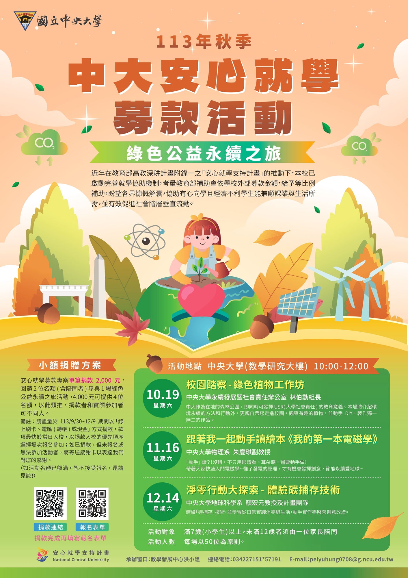 中央大學結合永續發展與公益活動為本校經濟弱勢的學子舉辦113年秋季安心就學募款活動-綠色公益永續之旅,本系列公益活動邀請中央大學永續發展暨社會責任辦公室、物理系朱慶琪副教授、地科系顏宏元教授及計畫團隊,輪番接棒綠色公益永續之旅講師,齊力貢獻專長為經濟不利學子募款建立永續基金。