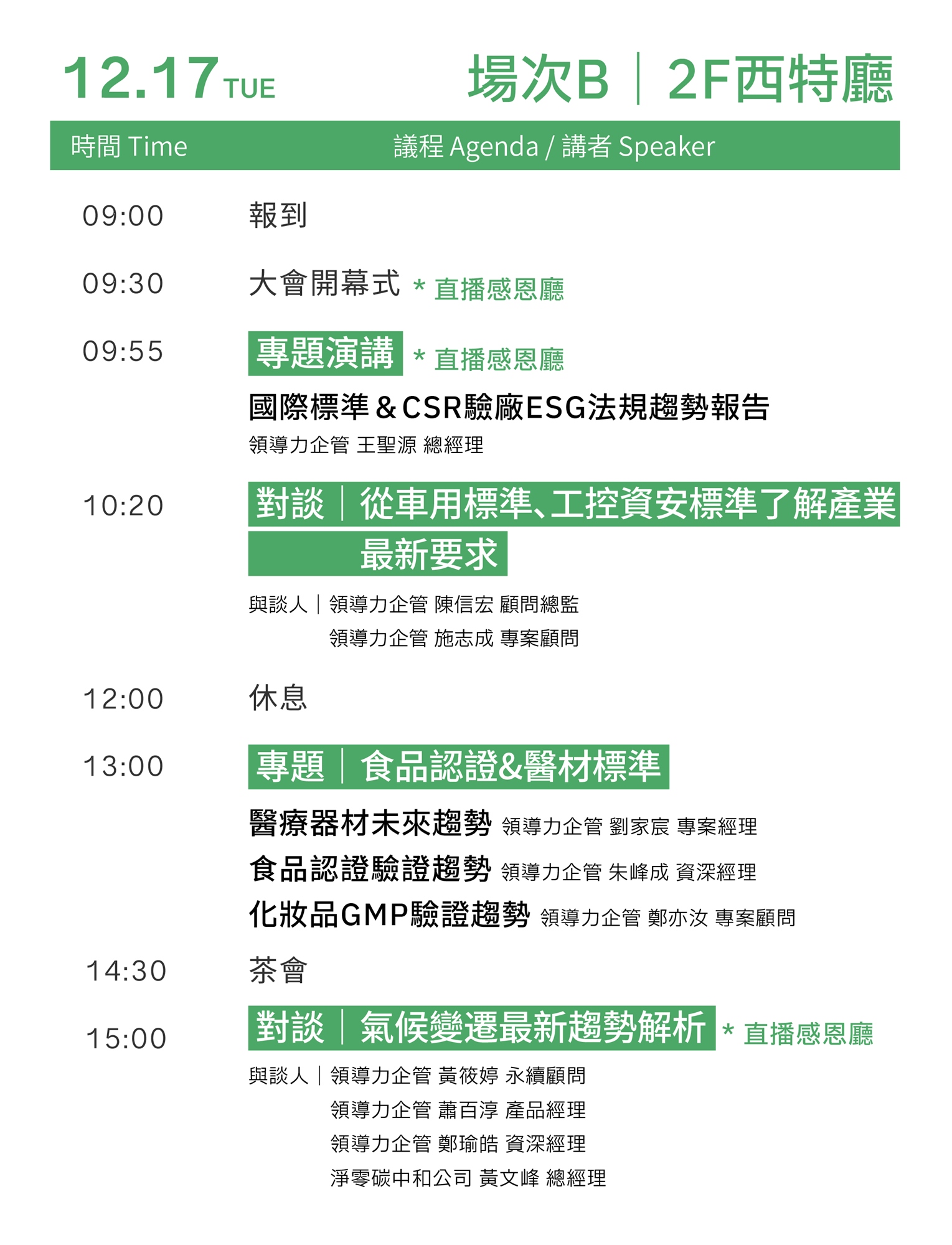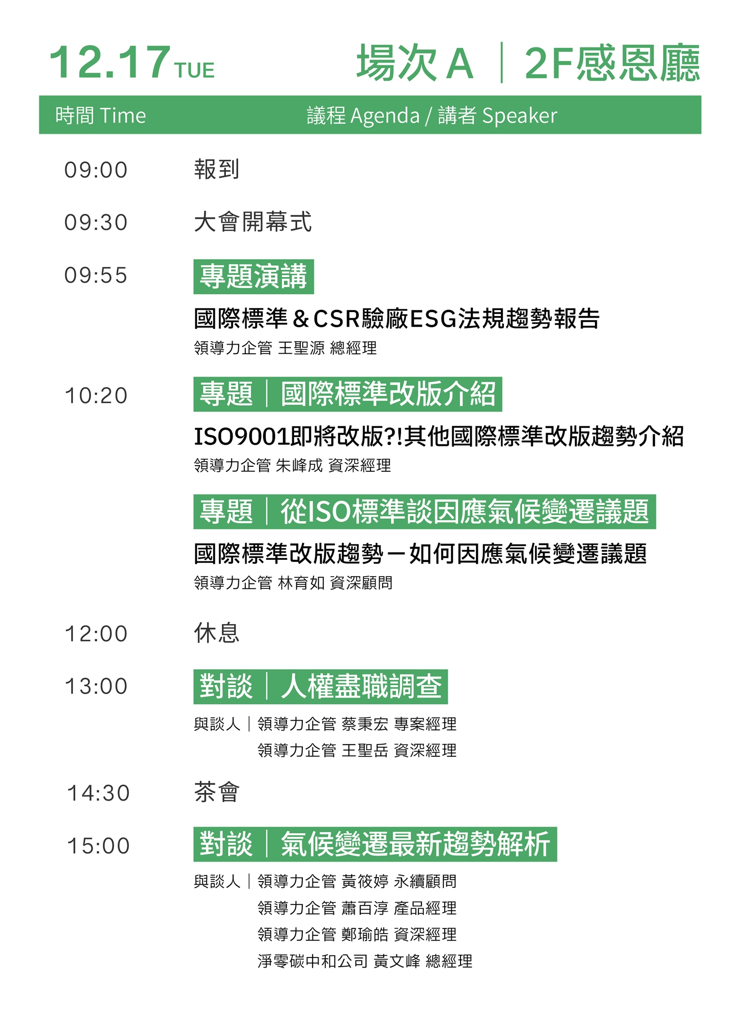- 首日 ISO 專場 將深入解析各領域ISO國際標準,協助綠領工作者及企業掌握國際規範的最新發展;