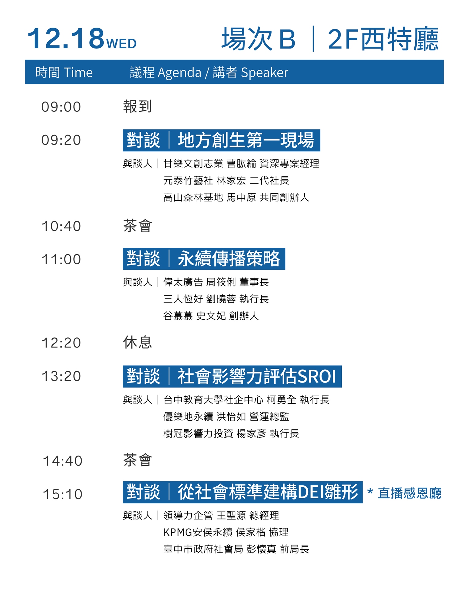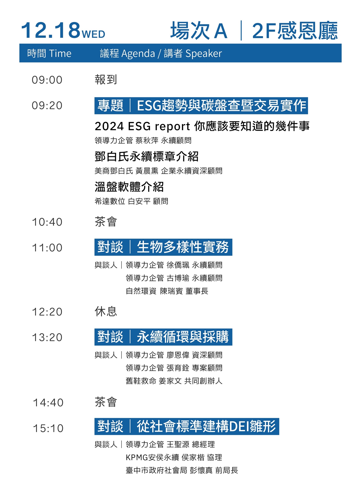- 次日 ESG 專場 則將結合近年來熱門永續主題,探討如何結合原則與實踐,推動企業與利害關係人協作之永續行動。