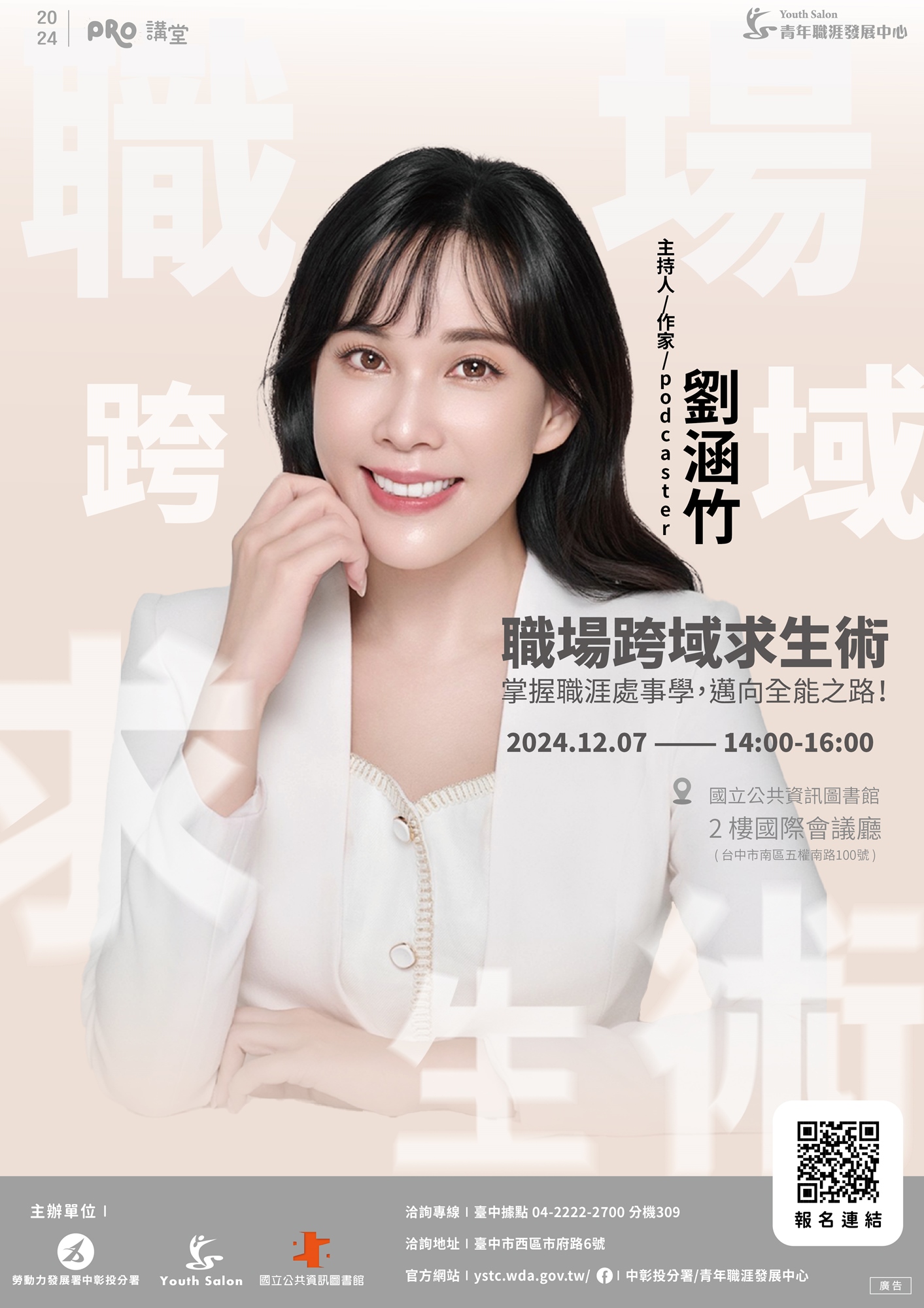 此次講座將以劉涵竹個人職涯轉換的精采歷程給予在職場上奮力求生的青年們建議與鼓勵,並可以向劉主播學習如何經營「自己」這個品牌,促使各位朋友了解自我、跨域探索找到自己喜歡且具有熱忱的工作。
